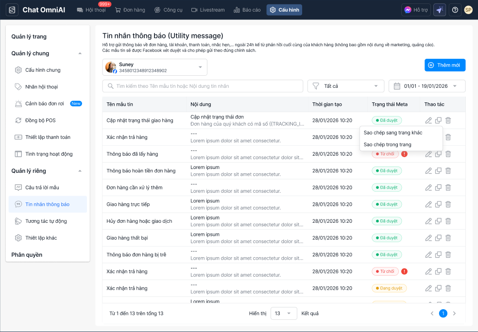 Tính năng quản lý danh sách thông báo trên Sapo giúp shop dễ dàng theo dõi, chỉnh sửa và quản lý các mẫu tin nhắn thông báo đã tạo. Bạn có thể lọc, tìm kiếm, sao chép và chỉnh sửa các mẫu tin nhắn theo nhu cầu sử dụng, đảm bảo việc gửi thông báo ngoài 24 giờ luôn được thực hiện đúng chuẩn chính sách Facebook.