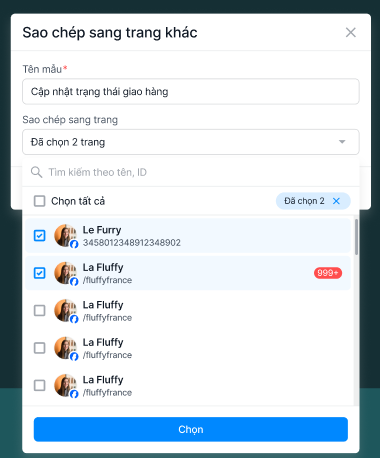 Hệ thống sẽ hiển thị popup để bạn tích chọn một hoặc nhiều trang Facebook mà bạn muốn sao chép mẫu tin gốc sang. Bạn có thể chỉnh sửa lại nội dung mẫu tin và ấn Lưu mẫu để xác nhận.
