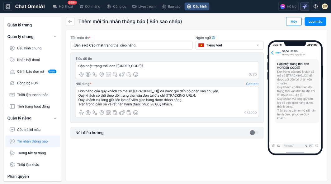 Hệ thống sẽ điều hướng bạn tới màn hình Thêm mới tin nhắn thông báo (Bản sao chép) chứa nội dung từ mẫu tin gốc. Bạn có thể chỉnh sửa lại nội dung và ấn Lưu mẫu để hoàn tất.