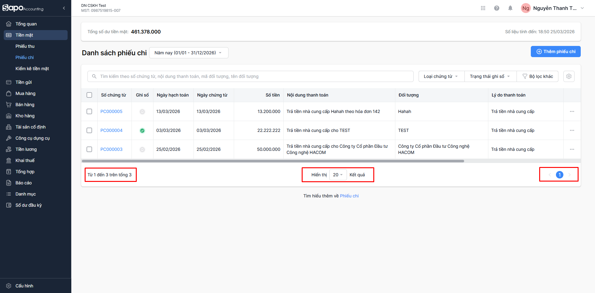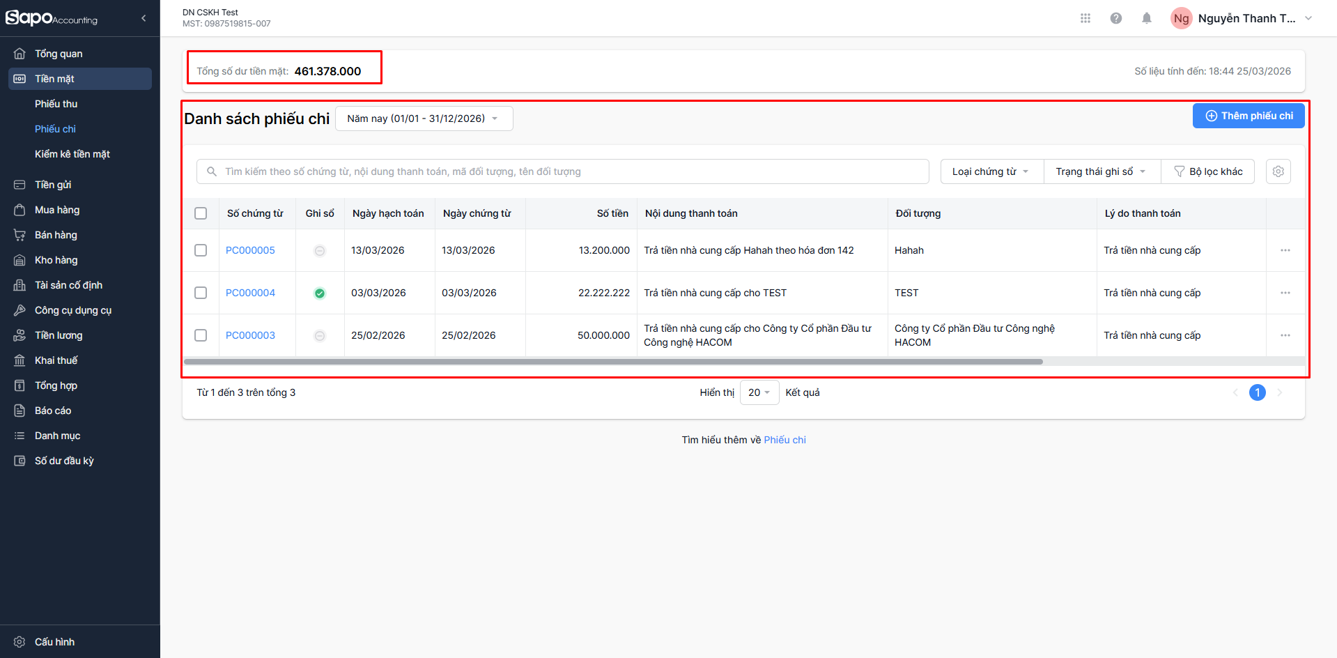 Màn hình Danh sách phiếu chi tiền mặt là nơi giúp bạn quản lý tập trung tất cả các chứng từ ghi nhận việc chi tiền từ quỹ tiền mặt của doanh nghiệp. Tính năng này cho phép bạn dễ dàng xem, tìm kiếm, lọc và thực hiện các thao tác quản lý phiếu chi một cách thuận tiện và hiệu quả.
