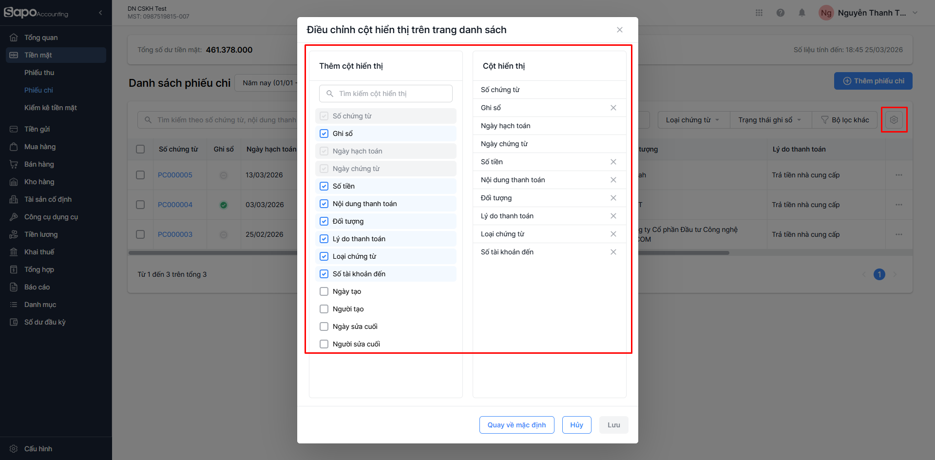 - Thêm cột hiển thị (bên trái): Bạn tích chọn vào các trường thông tin muốn hiển thị trên danh sách (ví dụ: Ghi sổ, Số tiền, Diễn giải, Đối tượng,...).