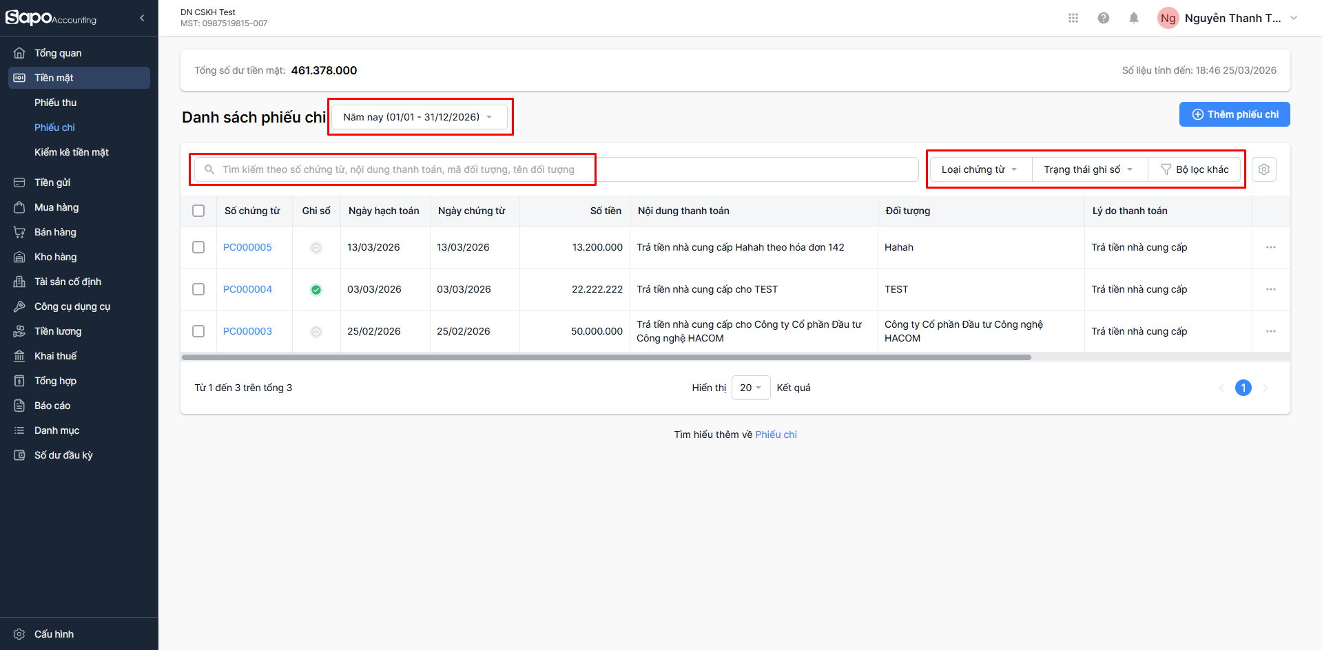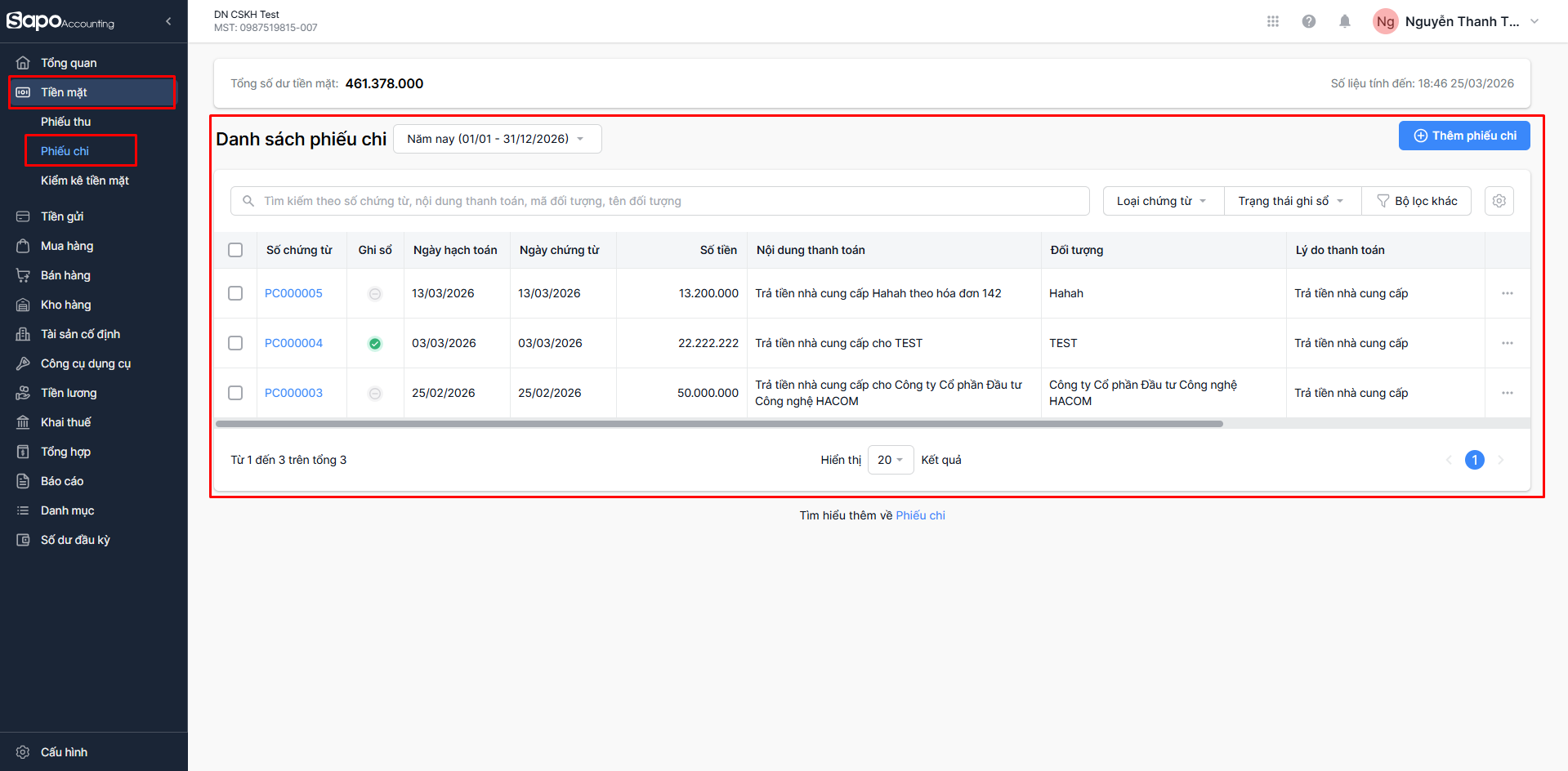 - Danh sách sẽ liệt kê tất cả các phiếu chi tiền mặt phát sinh trong "Năm nay". Dữ liệu được sắp xếp theo thứ tự thời gian (từ ngày hạch toán mới nhất) và theo các trường hiển thị mặc định.
