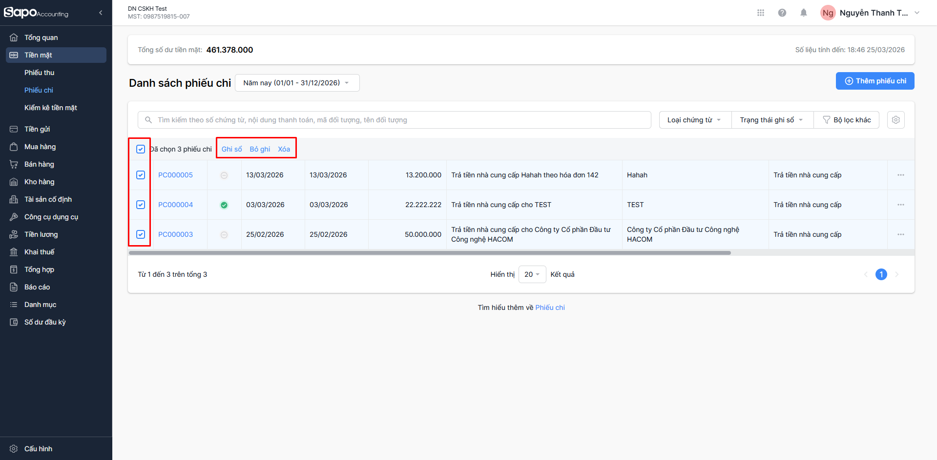 - Ghi sổ: Nhấp vào nút Ghi sổ để ghi sổ các chứng từ đã chọn.