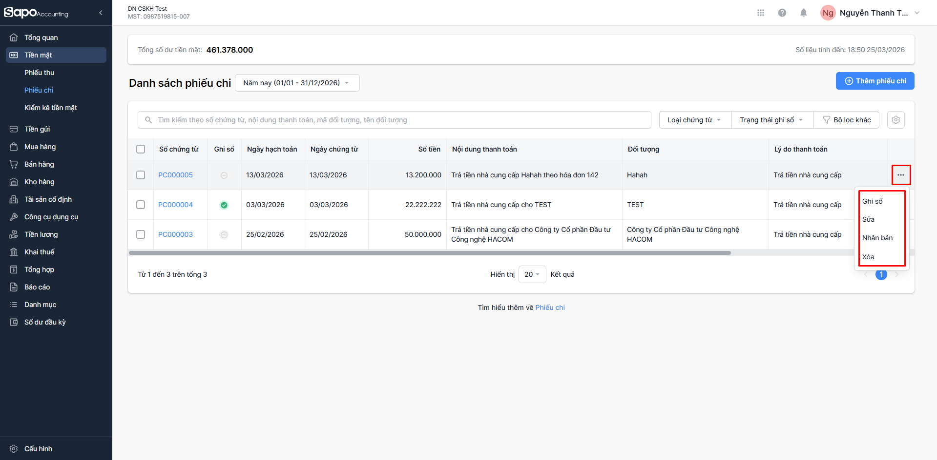- Sửa: Nhấp vào Sửa để đi đến trang chi tiết và cập nhật thông tin phiếu chi. Xem hướng dẫn chi tiết tại đây.