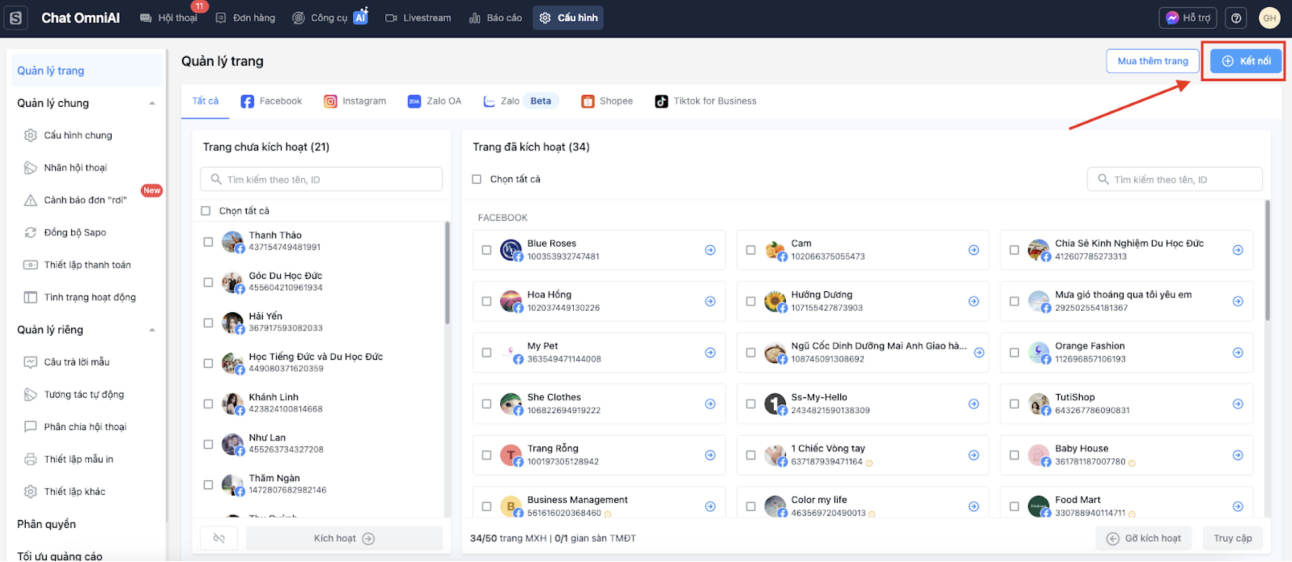 - Nếu đã kết nối kênh: Chọn Cấu hình → Quản lý trang → Kết nối (góc trên bên phải).