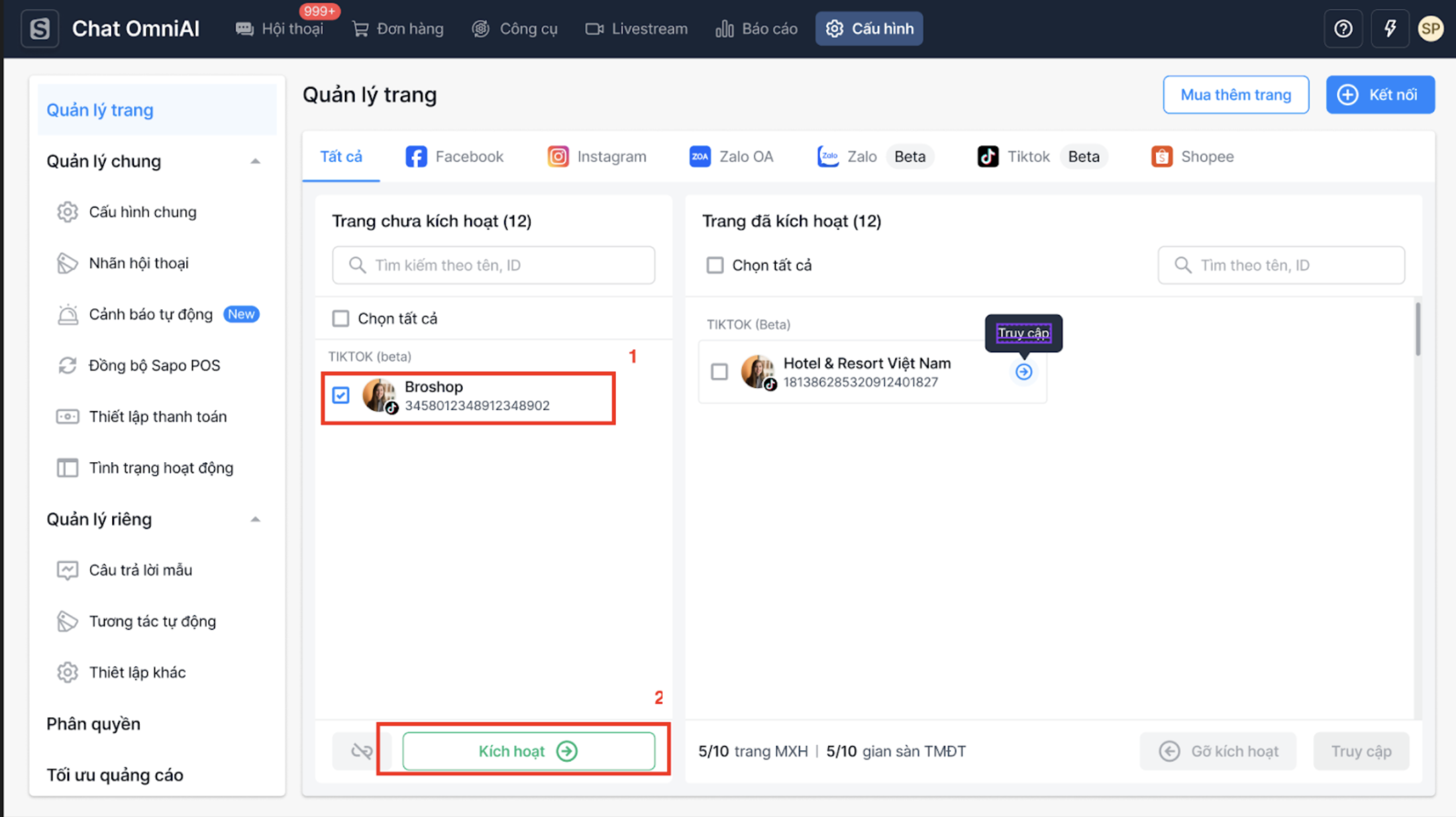 - Chọn Trang TikTok đã kích hoạt và nhấn Truy cập để chuyển đến màn hình Hội thoại/Livestream và bắt đầu vận hành.