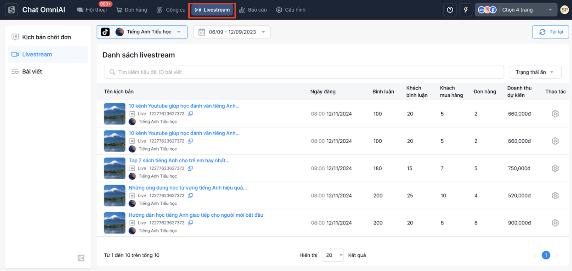 - Đơn hàng: Tổng số đơn hàng đã tạo từ livestream.