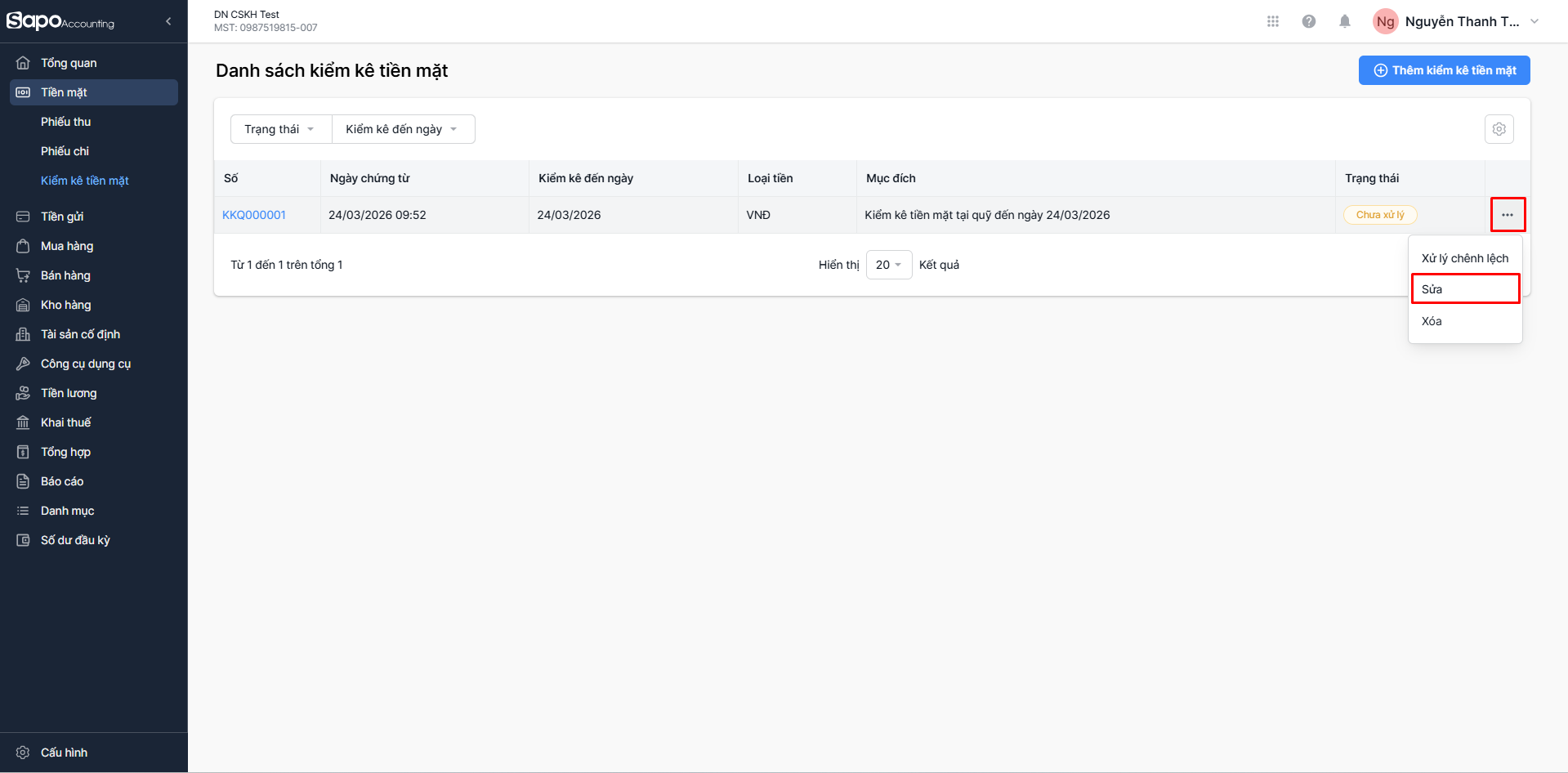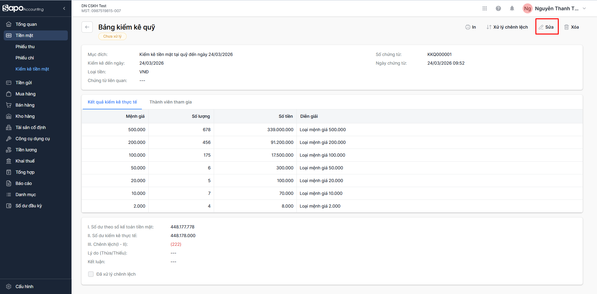 - Cách 2: Nhấp chọn Số hoặc dòng chứa bảng kiểm kê cần sửa > Tại màn hình chi tiết Bảng kiểm kê quỹ, chọn Sửa (góc trên bên phải màn hình)