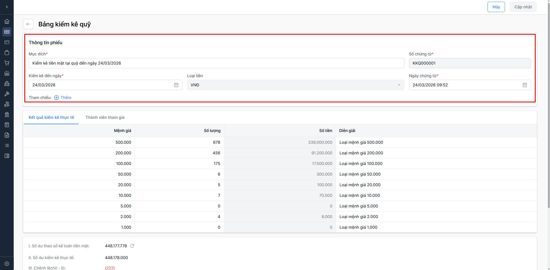- Chọn Hủy: Hủy chỉnh sửa biên bản kiểm kê tiền mặt và quay lại màn hình danh sách