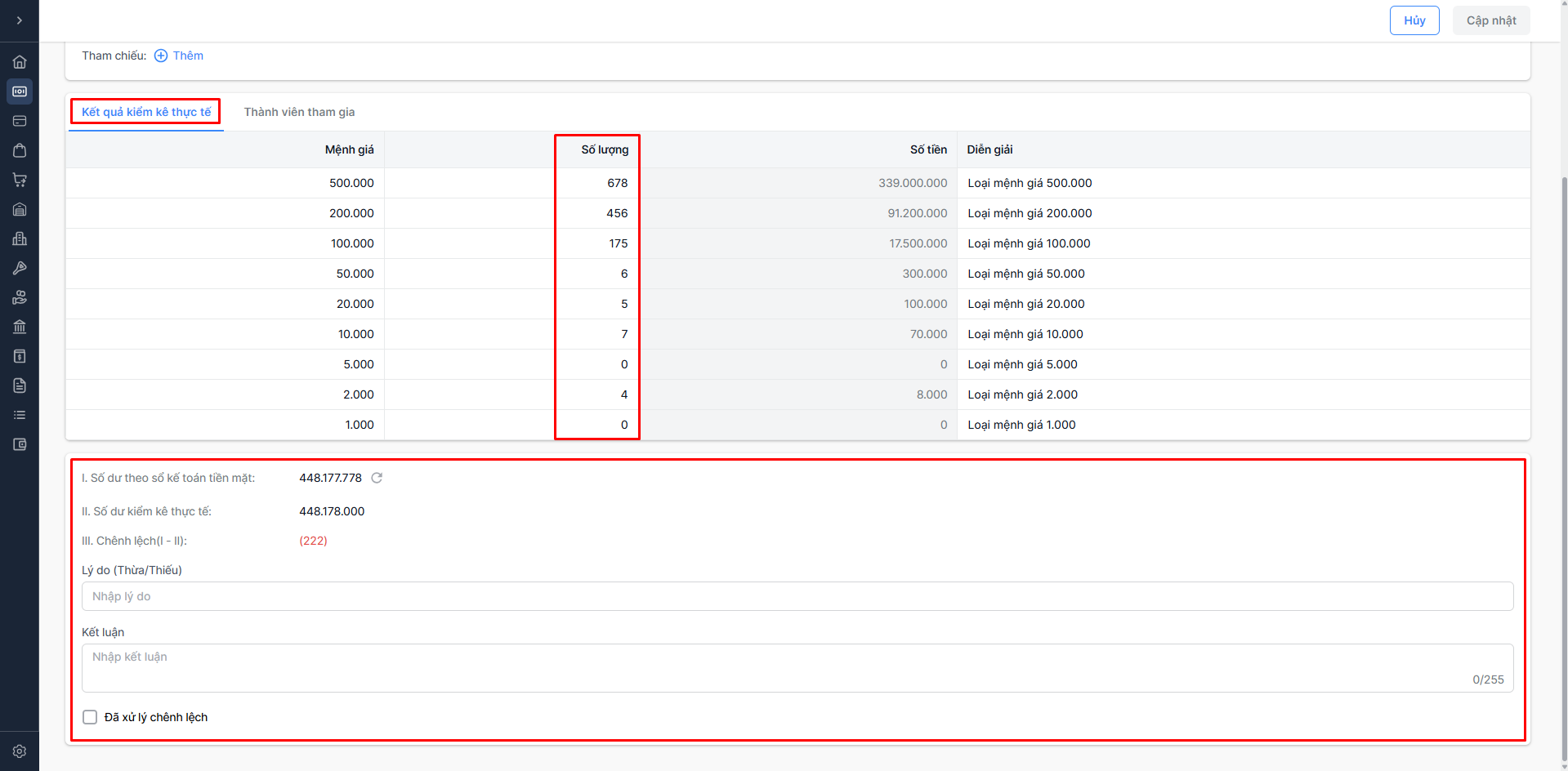 - Số lượng: Có thể chỉnh sửa số lượng đếm được cho từng mệnh giá