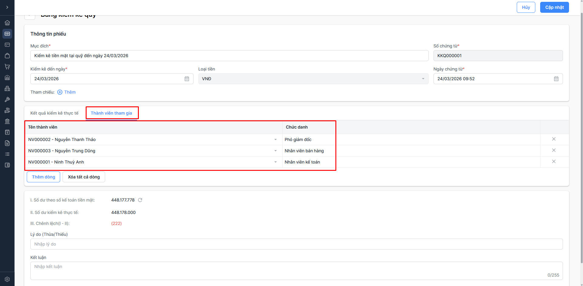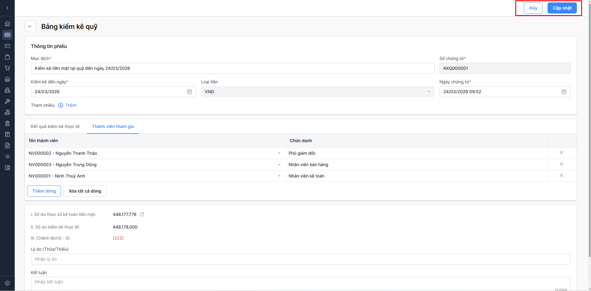 Bước 3: Chỉnh sửa thông tin bảng kiểm kê quỹ