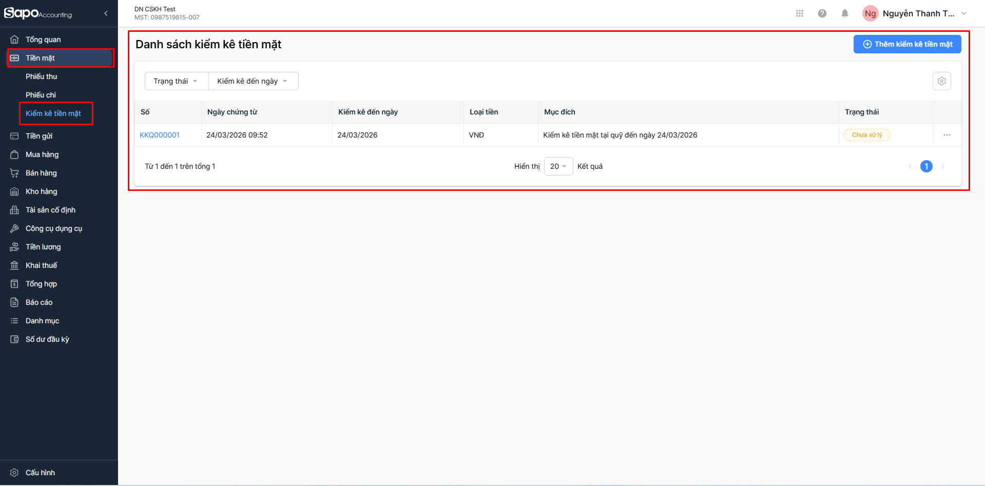 - Biên bản kiểm kê tiền mặt đã được lập và ở trạng thái Chưa xử lý. Xem hướng dẫn chi tiết tại đây.