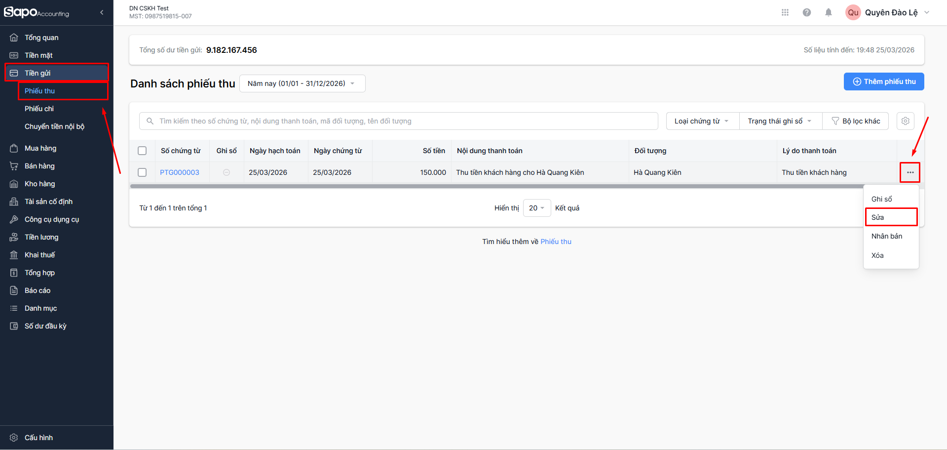 Có 2 cách để bạn truy cập vào màn hình sửa phiếu thu: