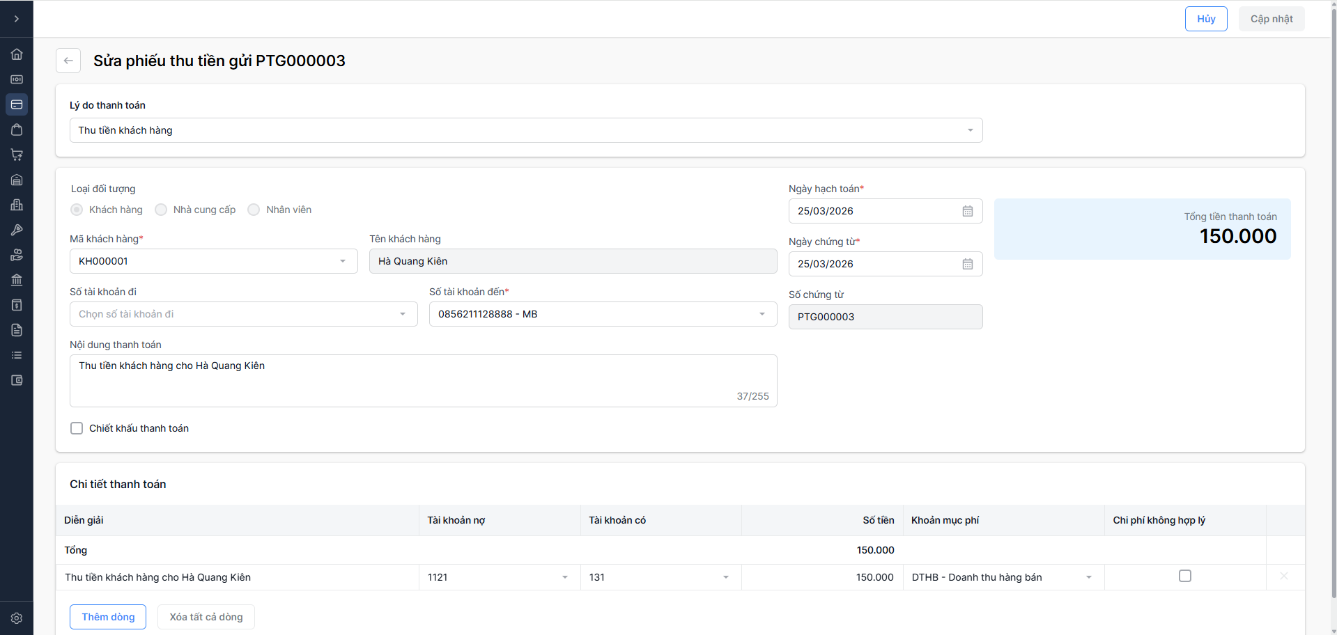 Hệ thống sẽ chuyển bạn đến trang Sửa phiếu thu "Số chứng từ". Giao diện trang này tương tự như trang "Thêm mới phiếu thu", nhưng các trường đã có sẵn thông tin bạn nhập trước đó.