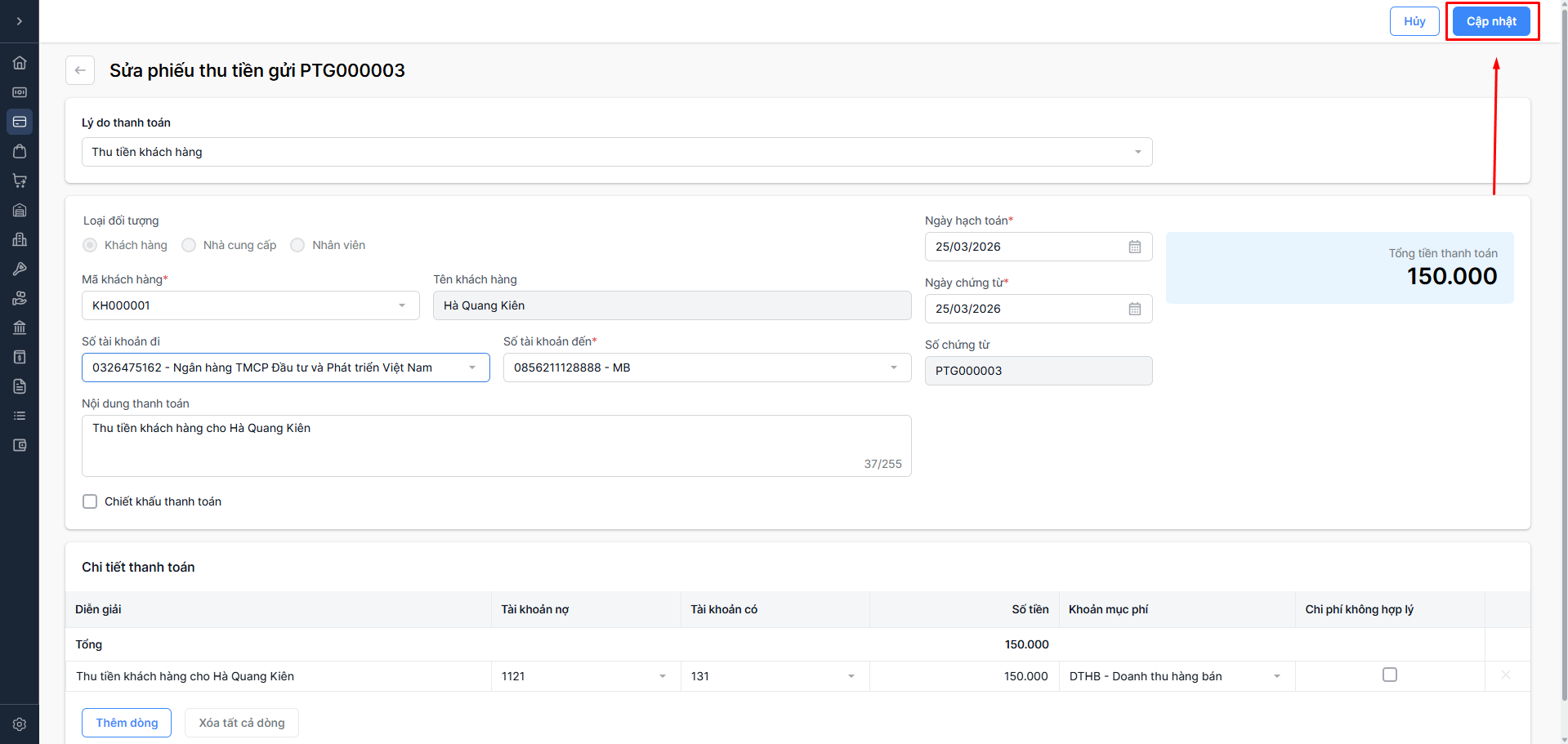 Bạn có thể cập nhật thông tin Diễn giải, Số tiền thu, Mã đối tượng, Tên đối tượng, Khoản mục phí tương ứng.