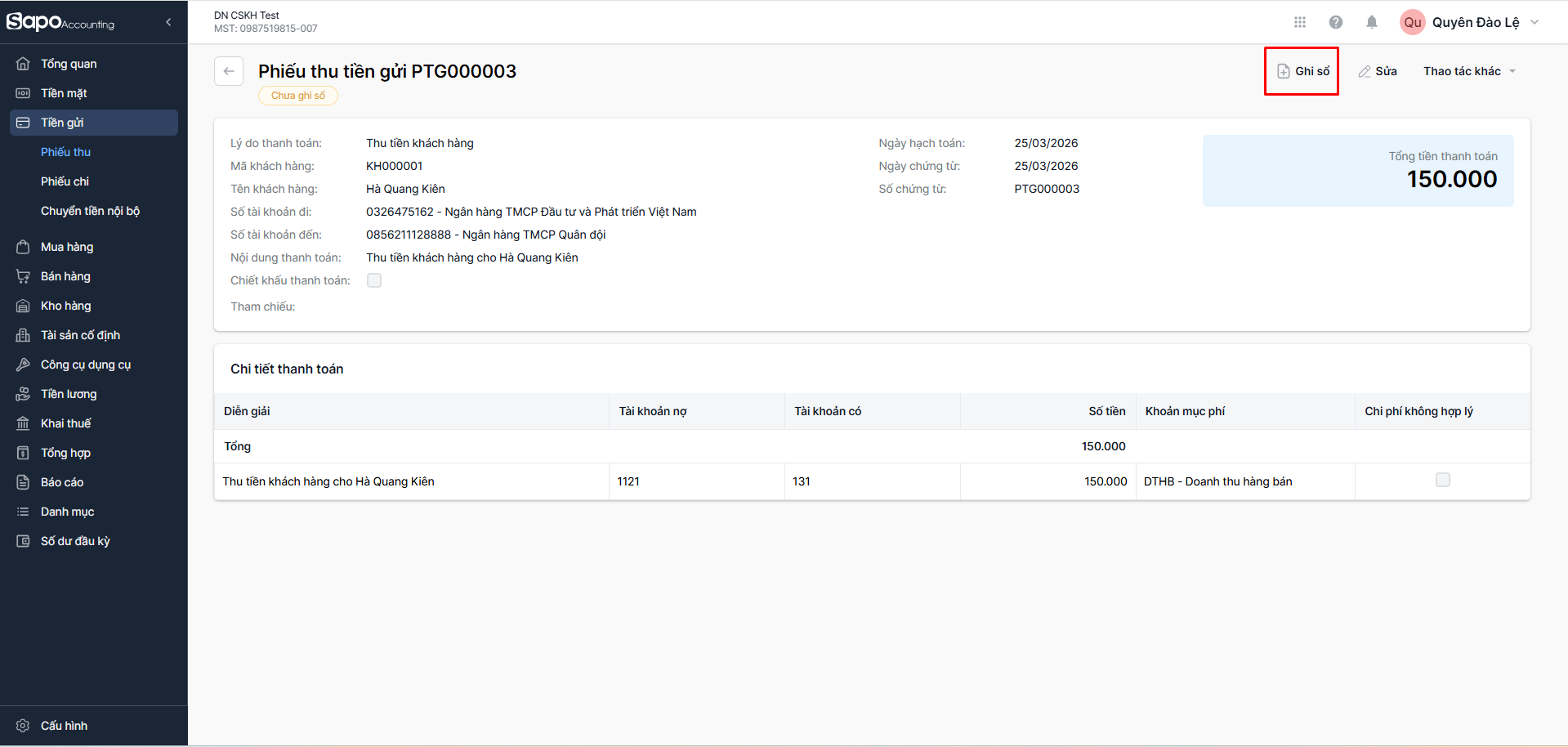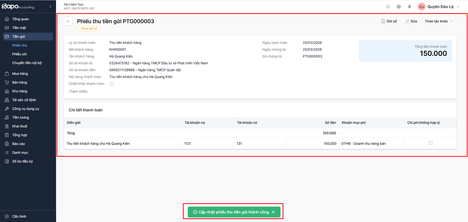 - Sau khi Cập nhật thông tin, phiếu thu đang ở trạng thái Chưa ghi sổ sẽ không làm thay đổi số liệu trên báo cáo. Bạn cần thực hiện Ghi sổ để hạch toán và ghi nhận số tiền thu trên báo cáo.
