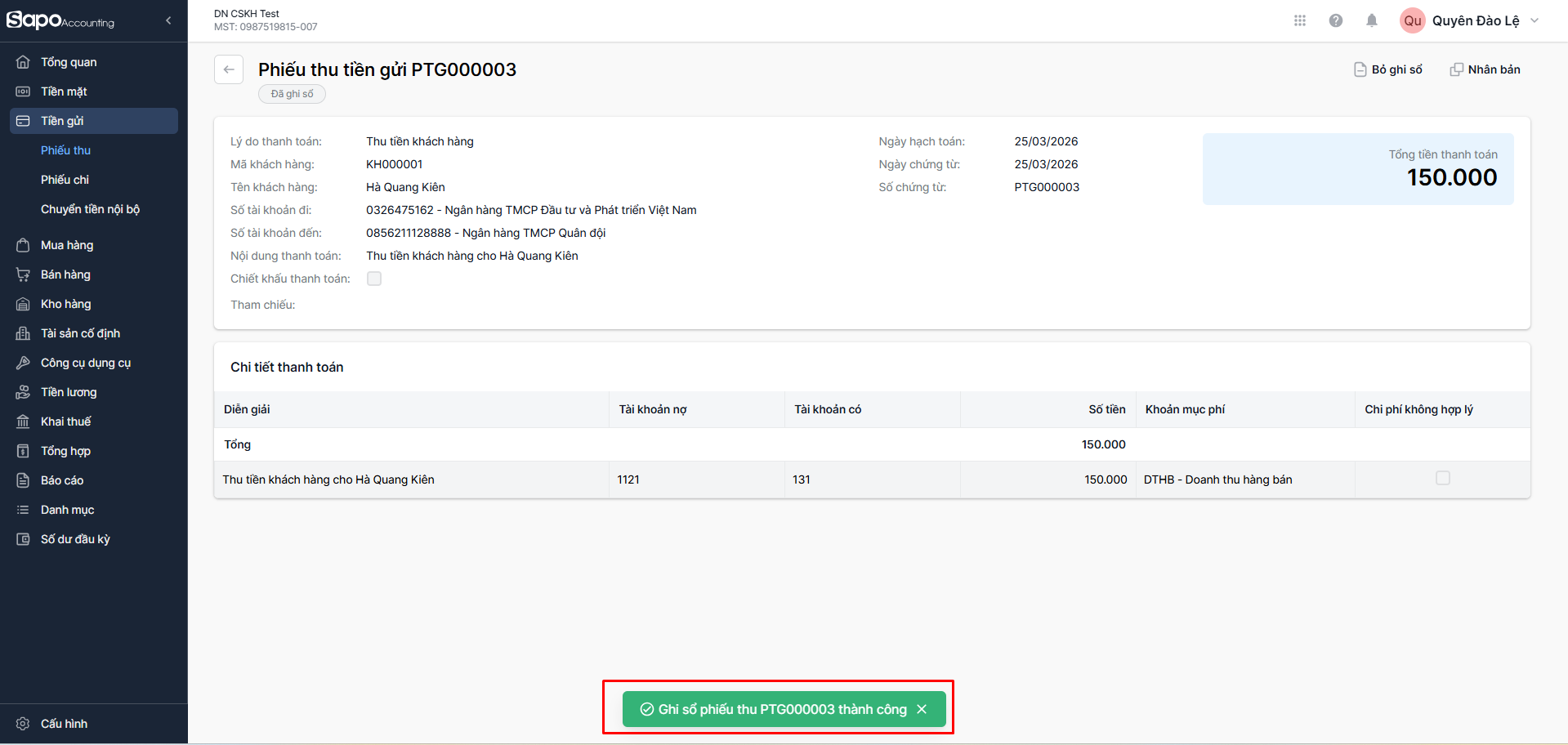 - Tài khoản của bạn đã được phân quyền Nghiệp vụ > Tiền gửi > Phiếu thu.