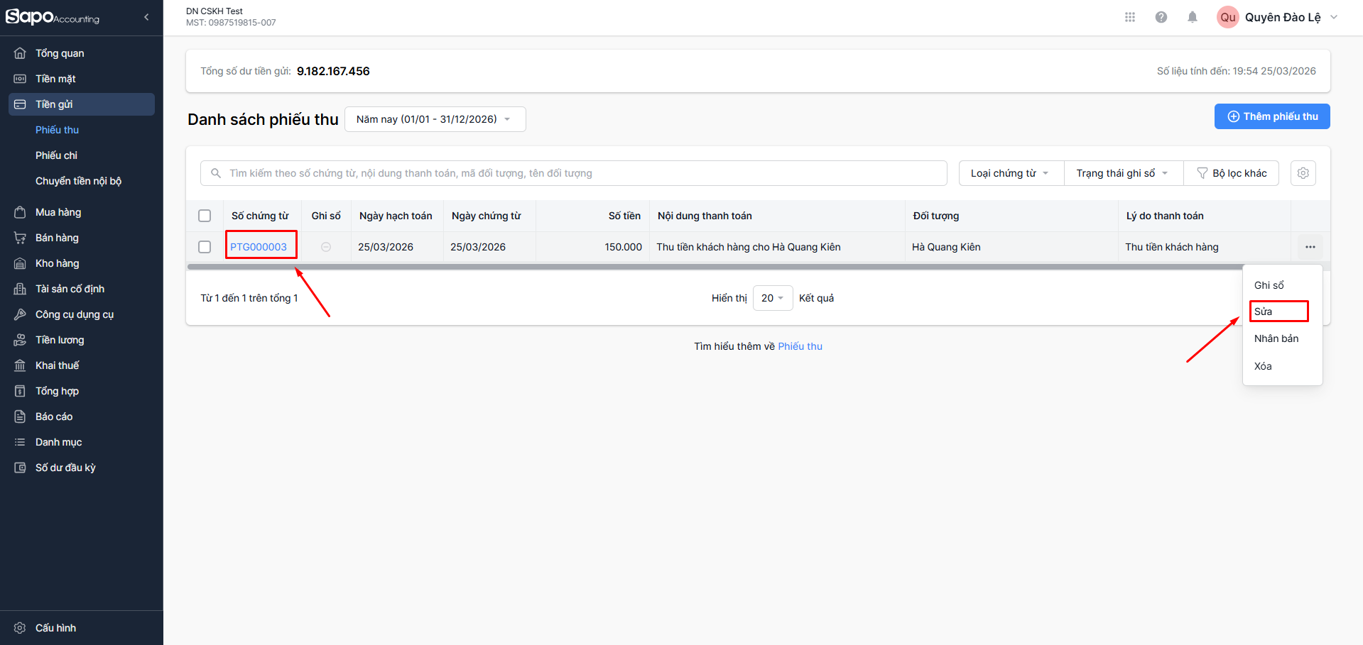 - Cách 2: Nhấp chọn Số chứng từ hoặc dòng chứa chứng từ cần sửa. Tại màn hình chi tiết phiếu thu, chọn nút Sửa (ở góc trên bên phải màn hình).