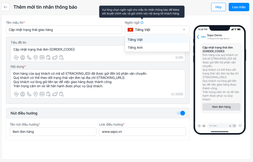 - Ngôn ngữ (Mặc định là Tiếng Việt): Chọn ngôn ngữ phù hợp (Tiếng Việt/ Tiếng Anh) tương ứng với nội dung tin nhắn để Meta/Facebook xét duyệt và gửi tin đúng ngôn ngữ tới khách hàng.
