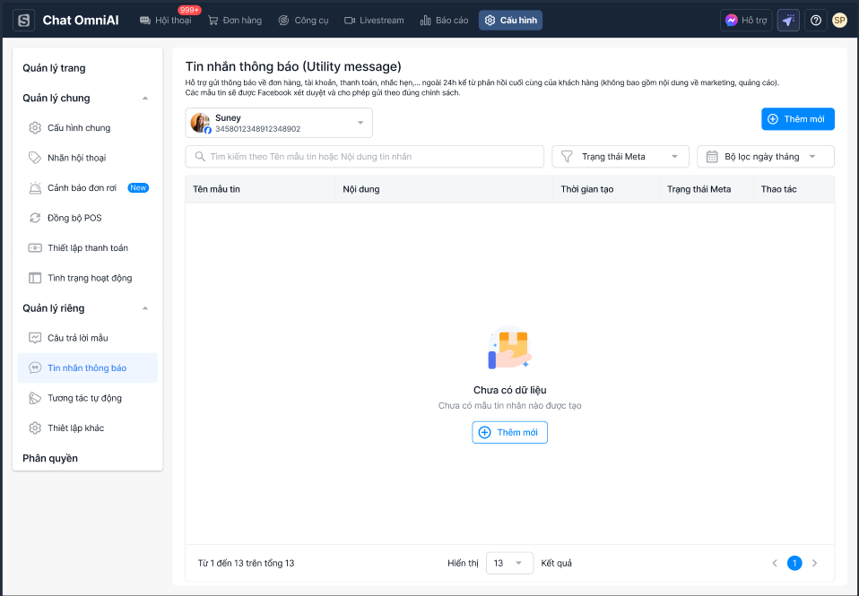 Để giúp các nhà bán hàng gửi thông báo ngoài 24 giờ đúng chuẩn chính sách Facebook, tính năng Utility Message (Tin nhắn Thông báo) trong Chat OmniAI trên Sapo OmniAI cho phép bạn tạo các mẫu tin nhắn thông báo theo mẫu được Meta phê duyệt. Mẫu tin nhắn này có thể bao gồm các thông tin liên quan đến đơn hàng, lịch hẹn, tài khoản mà không chứa nội dung marketing.