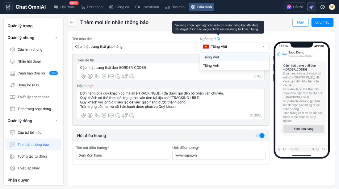 - Ngôn ngữ (Mặc định là Tiếng Việt): Chọn ngôn ngữ phù hợp (Tiếng Việt/ Tiếng Anh) tương ứng với nội dung tin nhắn để Meta/Facebook xét duyệt và gửi tin đúng ngôn ngữ tới khách hàng.