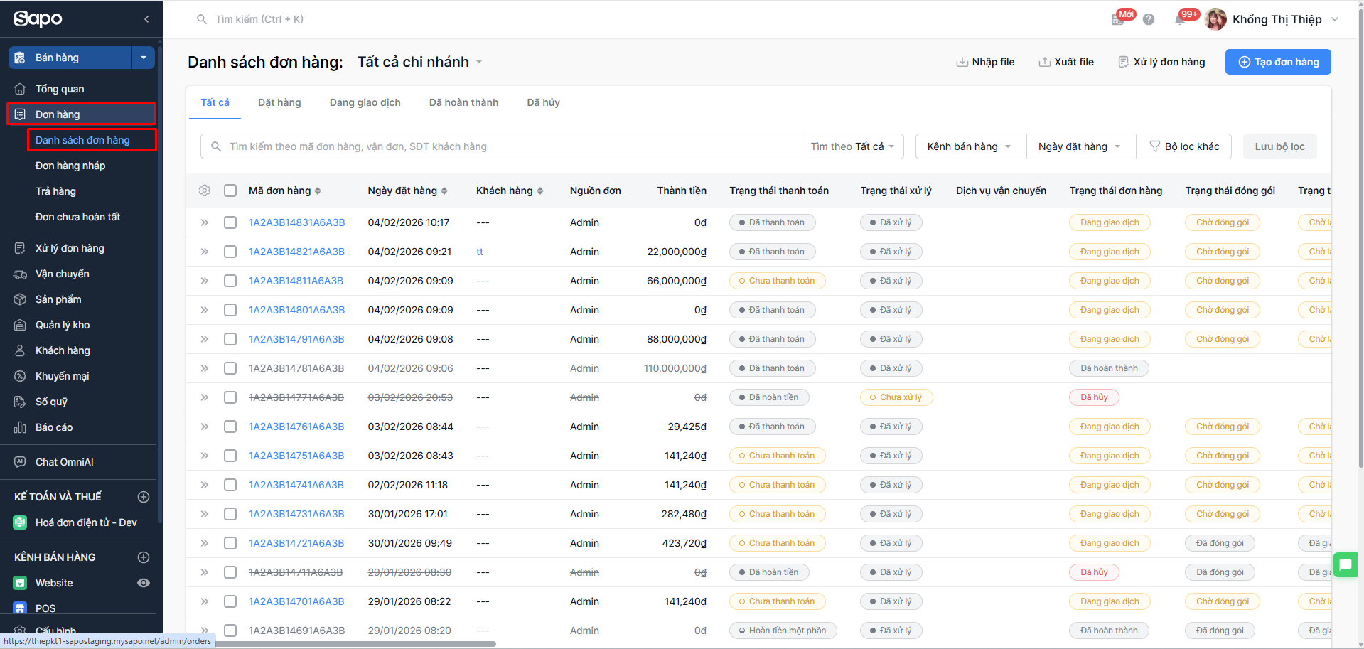- Trên thanh Menu bên trái trang quản trị Sapo OmniAI, bạn nhấn chọn mục Đơn hàng > Danh sách đơn hàng, hệ thống điều hướng bạn tới màn hình Danh sách đơn hàng.