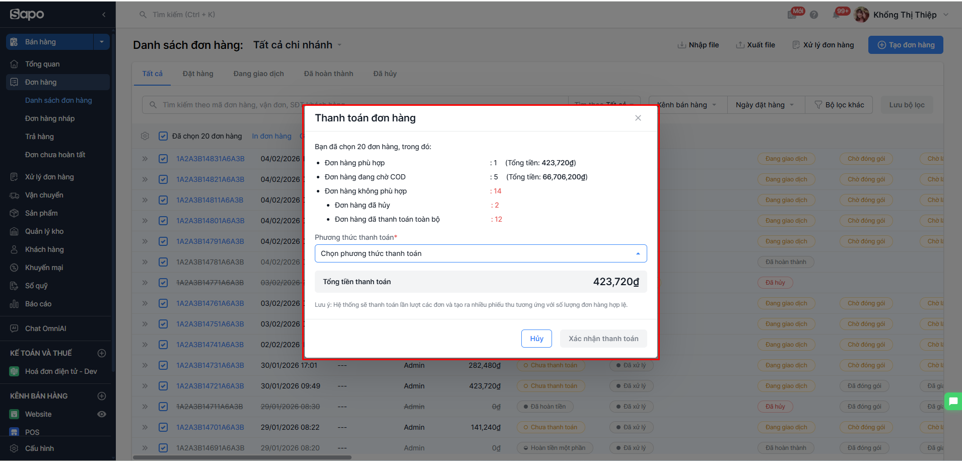 - Đơn hàng phù hợp: Số lượng đơn hợp lệ có thể thực hiện thanh toán (kèm Tổng tiền).