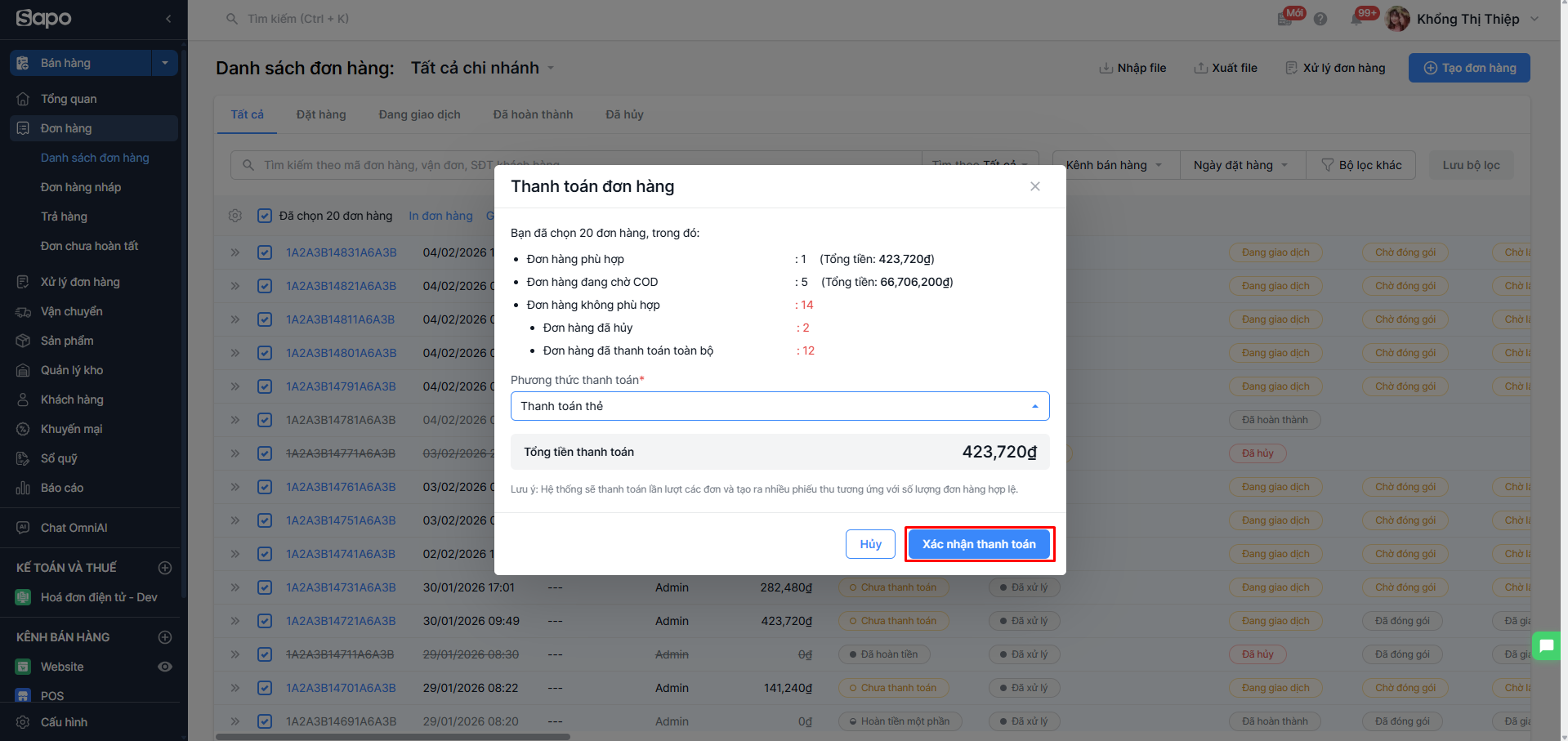 - Sau khi bạn chọn Phương thức thanh toán, nút Xác nhận thanh toán hiển thị màu xanh. Lúc này, bạn có thể nhấn nút Xác nhận thanh toán để xác nhận thực hiện thanh toán cho các đơn hợp lệ theo phương thức đã chọn hoặc nhấn Hủy để bỏ thực hiện thanh toán.