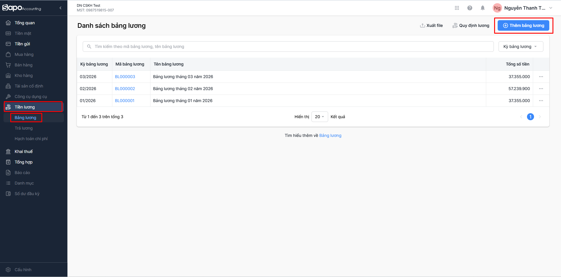 - Trên thanh menu bên trái trang quản trị, bạn chọn Tiền lương. Hệ thống tự động điều hướng bạn đến màn hình Danh sách bảng lương.
