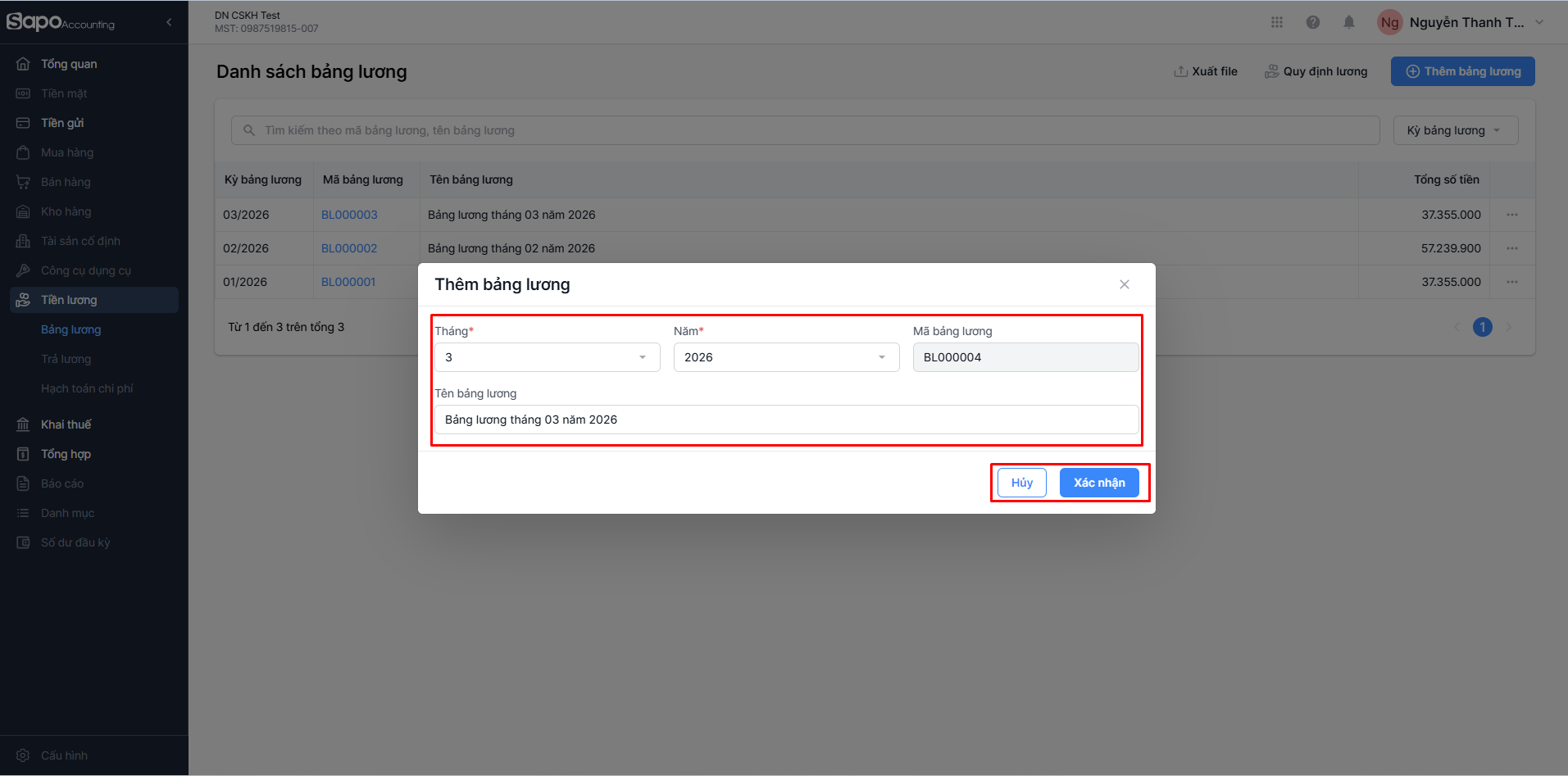 - Chọn Xác nhận để thêm mới bảng lương. Hệ thống sẽ chuyển sang màn hình chi tiết Thêm bảng lương.