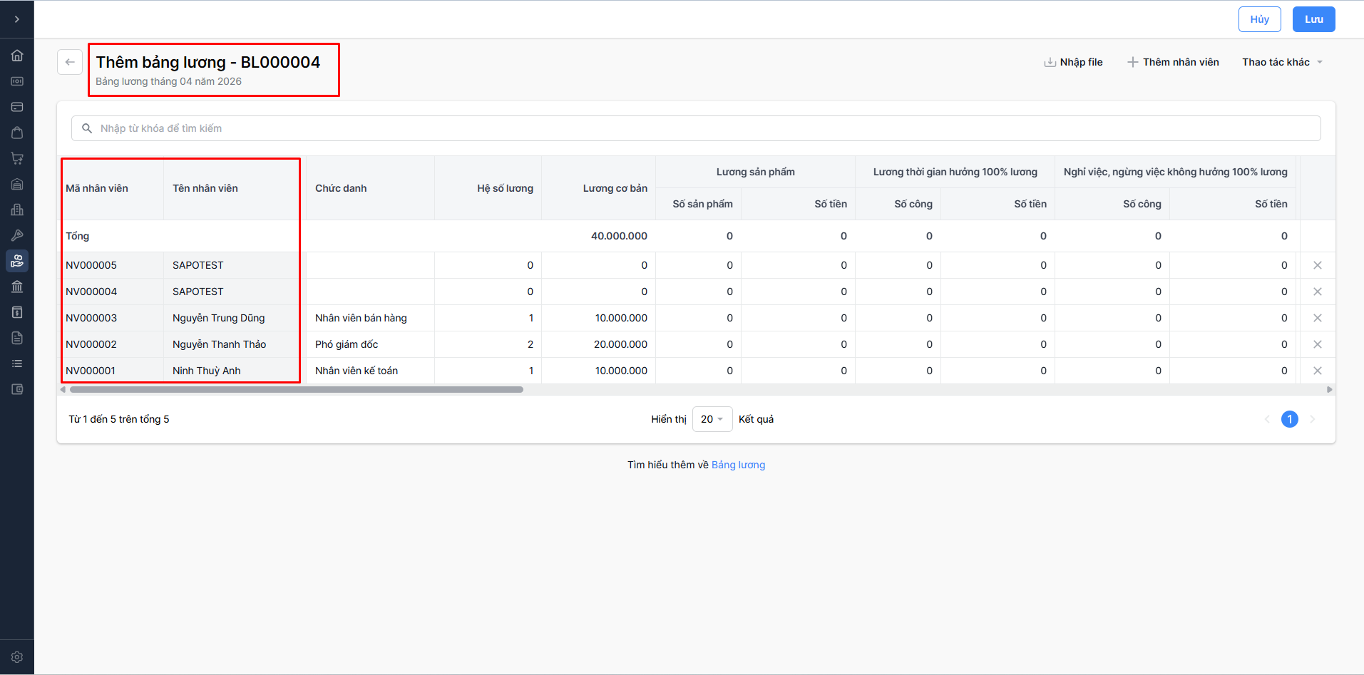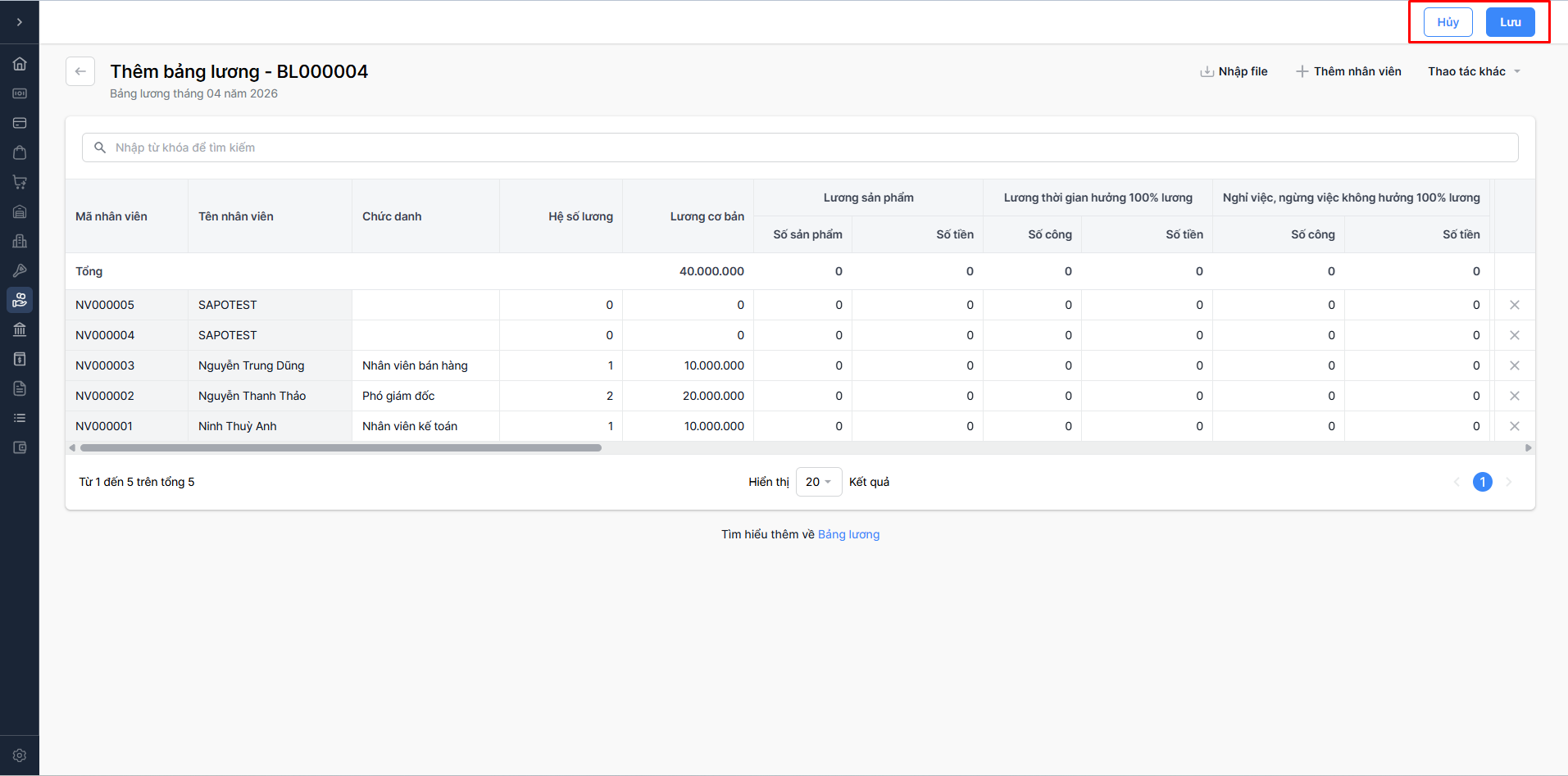 - Chọn Hủy để hủy thêm mới bảng lương và quay lại màn hình danh sách bảng lương.