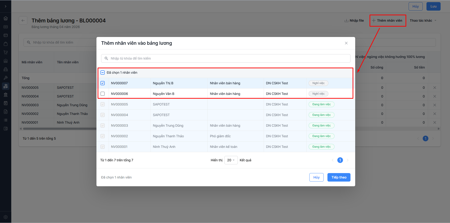 - Nhấn Tiếp theo để thêm nhân viên đã chọn vào bảng lương.