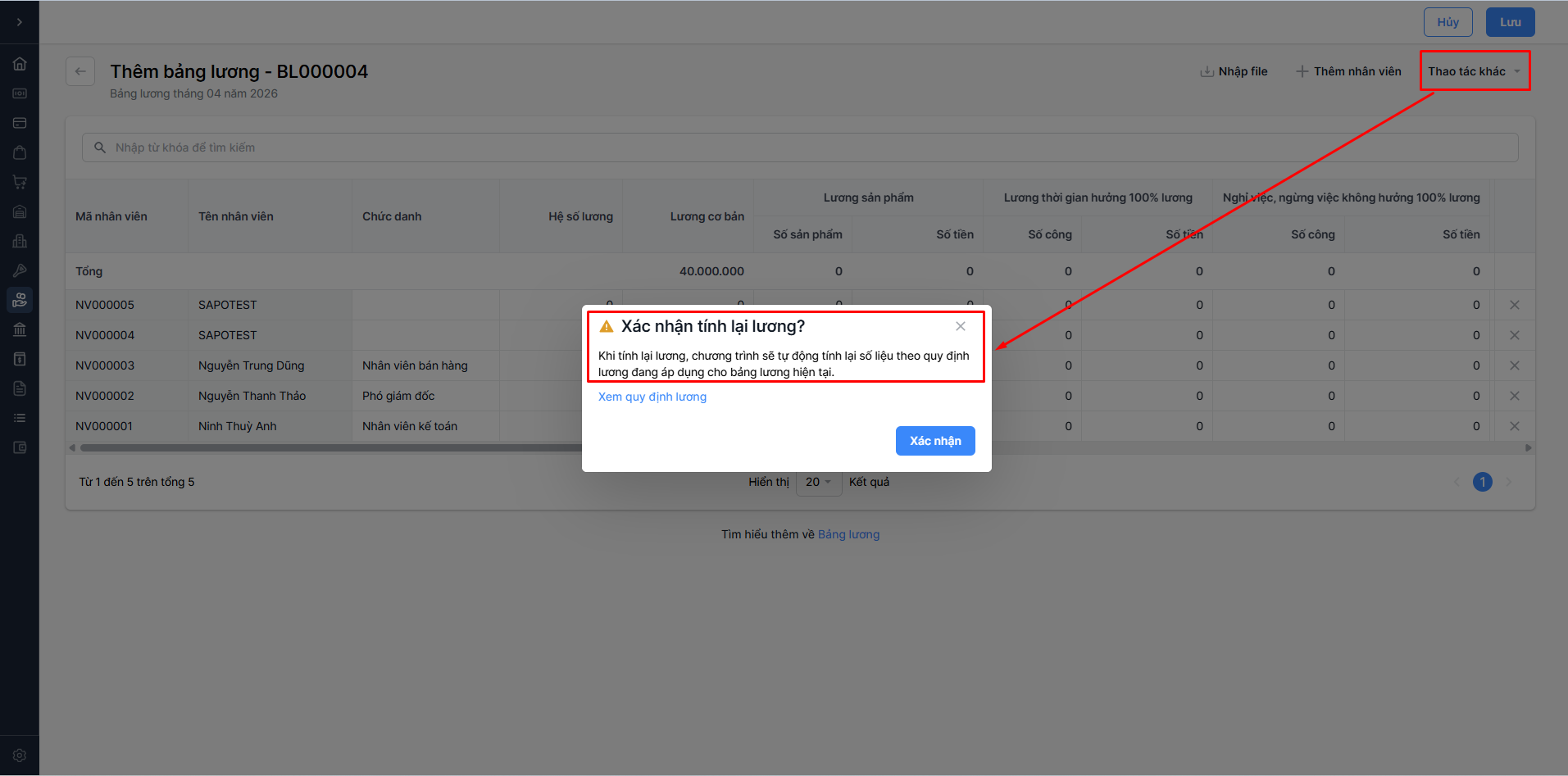 - Nhấp chọn Tính lại lương (góc trên bên phải màn hình) để hệ thống thực hiện tính lại lương cho nhân viên. Khi cửa sổ yêu cầu Xác nhận tính lại lương hiển thị, nhấp chọn Xác nhận.