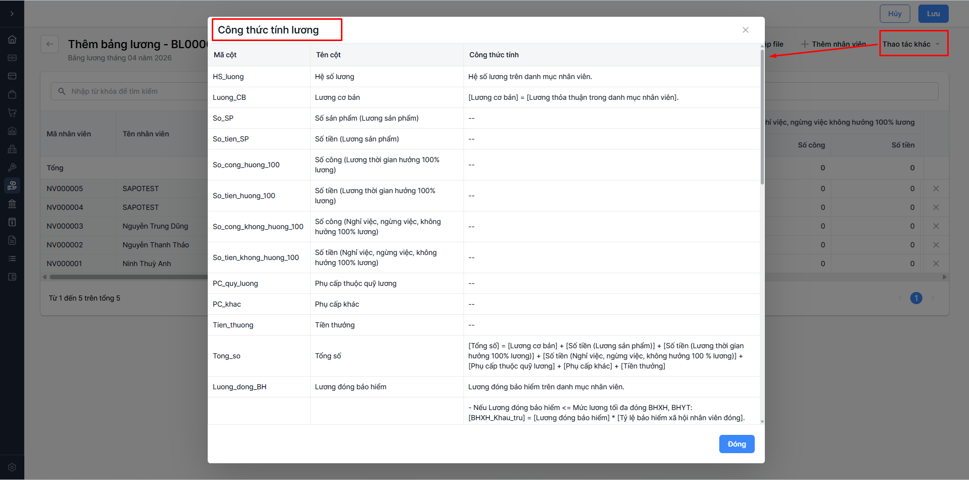 - Nhấp chọn Thao tác khác (góc trên bên phải màn hình), chọn Xem công thức tính lương để xem chi tiết công thức hệ thống sử dụng. Sau khi xem, chọn Đóng để quay lại màn hình chi tiết.