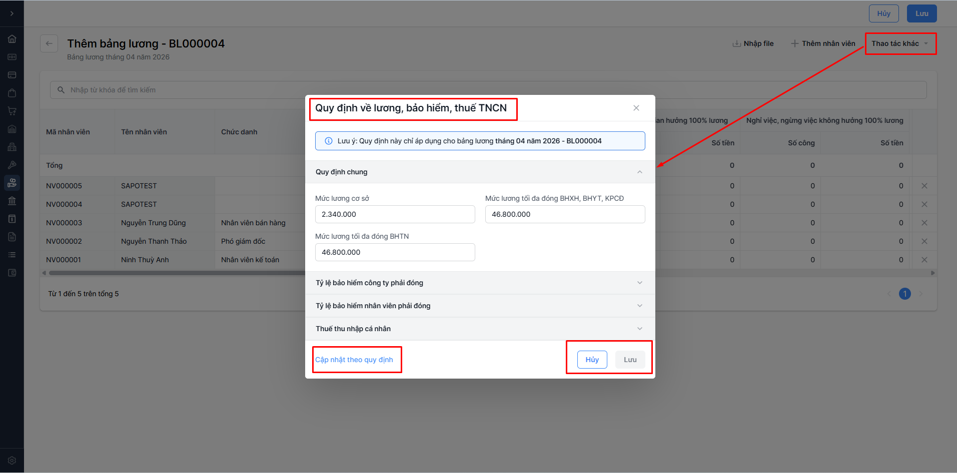 - Thao tác cập nhật Quy định lương chỉ được áp dụng cho bảng lương trong kỳ đang lập.