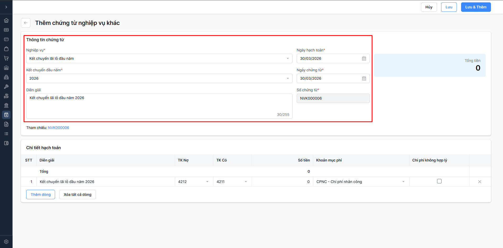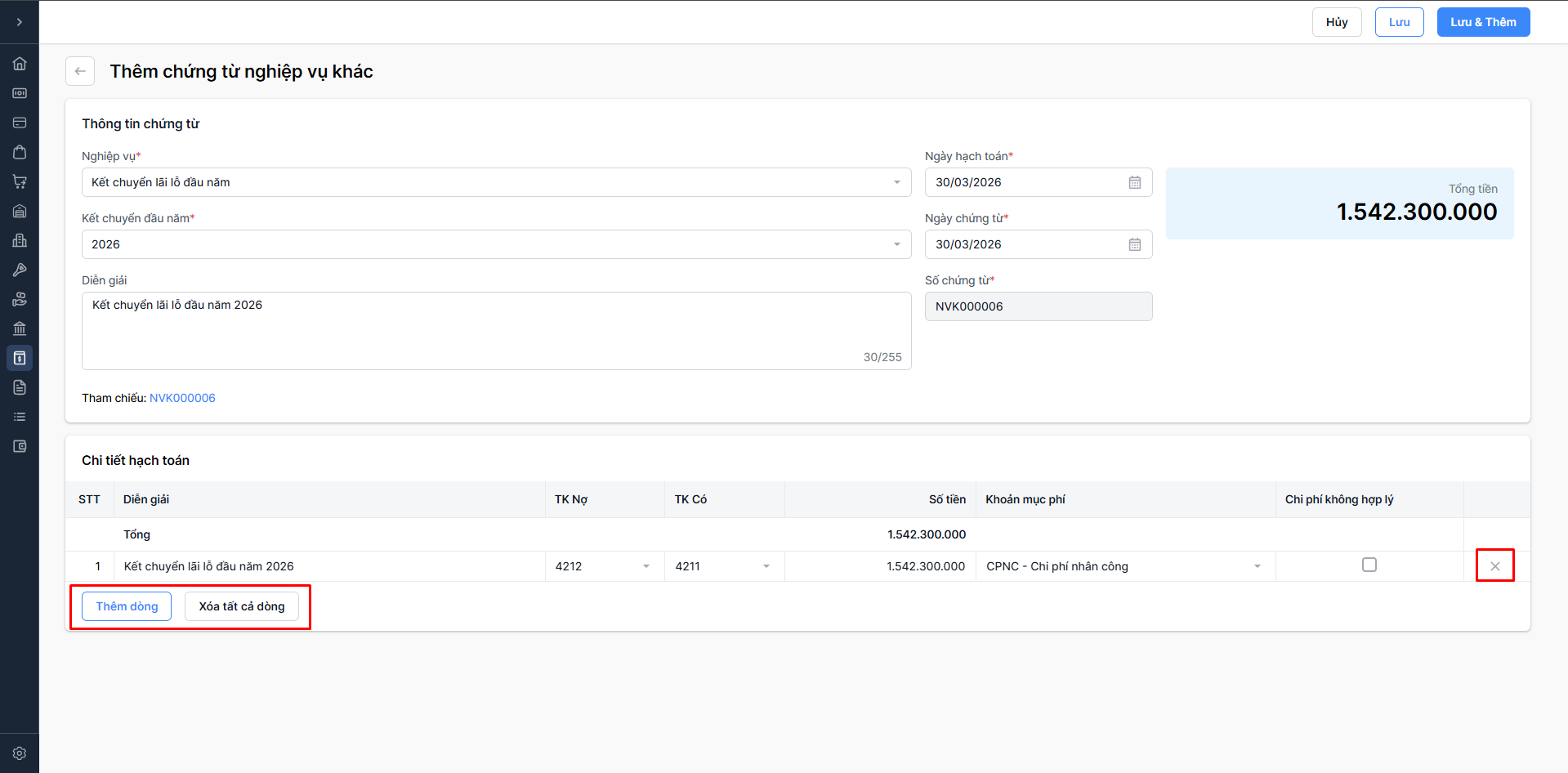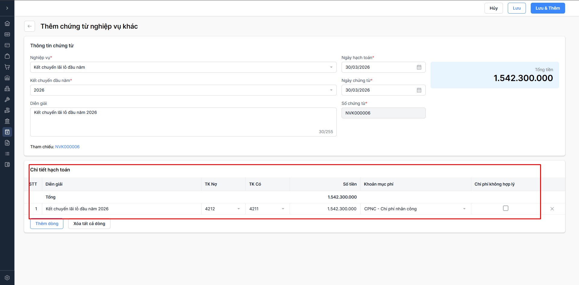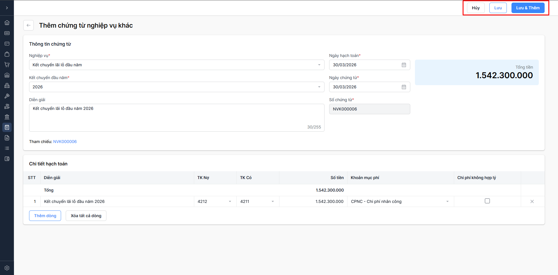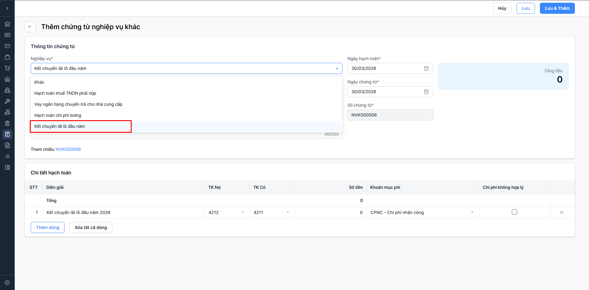 Chọn Lưu & thêm: Lưu thông tin chứng từ nghiệp vụ khác vừa nhập và tiếp tục thêm chứng từ nghiệp vụ khác mới.