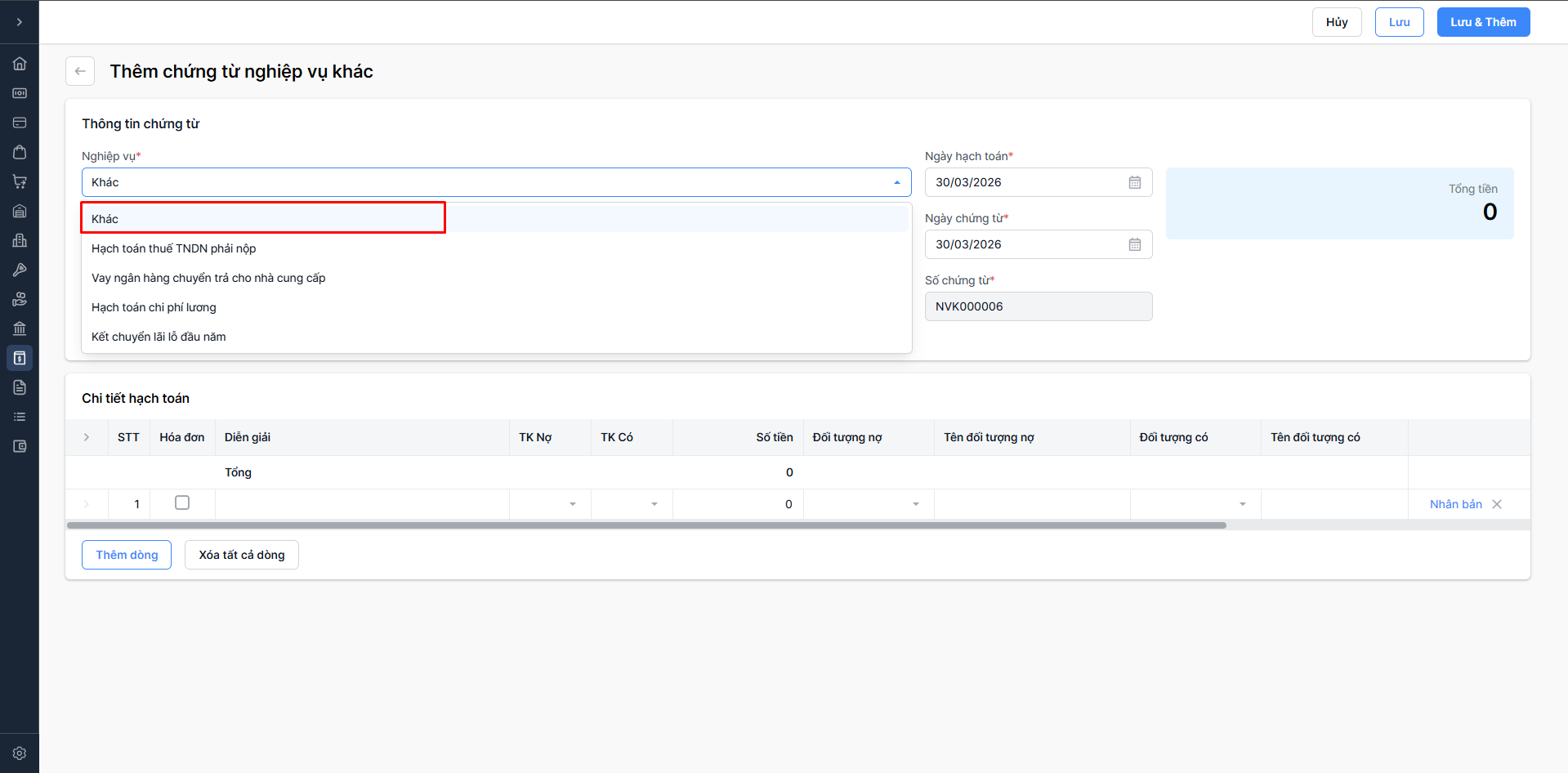 Tính năng Thêm mới Chứng từ nghiệp vụ khác cho phép bạn chủ động ghi nhận các nghiệp vụ kinh tế phát sinh ngoài các luồng bán hàng, nhập hàng thông thường. Đây là công cụ để bạn hạch toán các khoản chi phí quản lý, chi phí lương, nộp thuế, kết chuyển lãi lỗ,... hoặc điều chuyển số dư tài khoản, giúp đảm bảo dữ liệu kế toán luôn chính xác trước khi lên báo cáo tài chính chính thức.