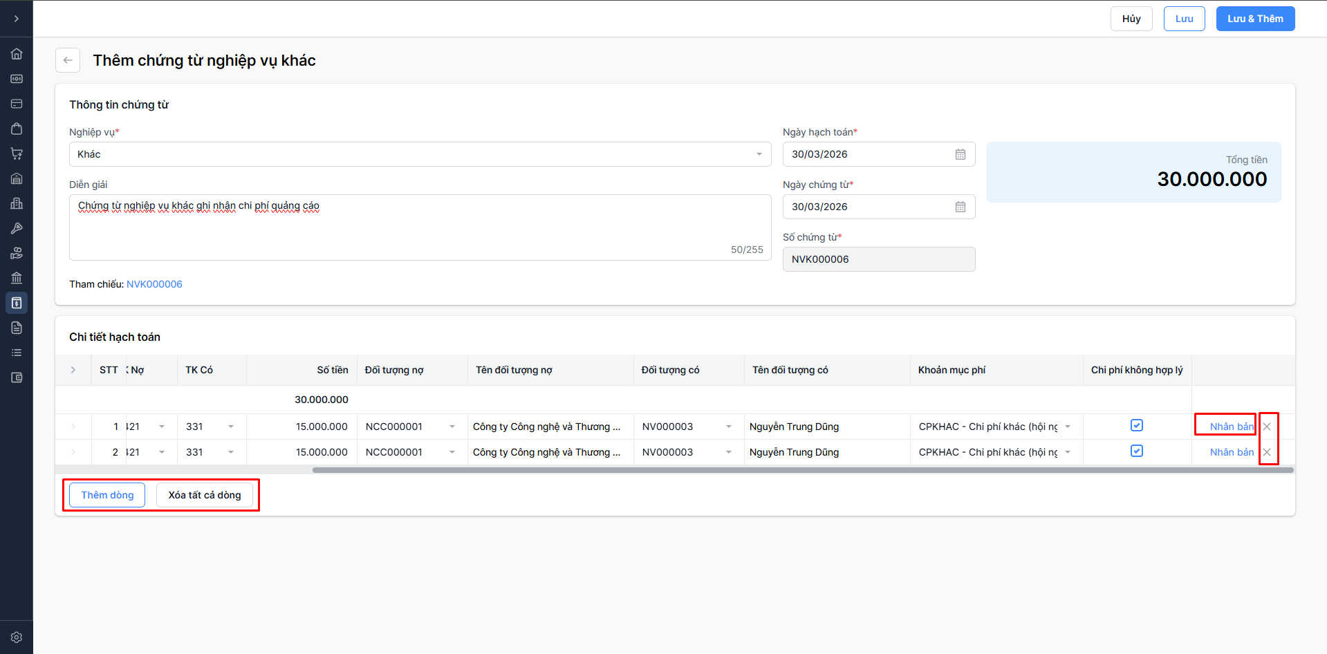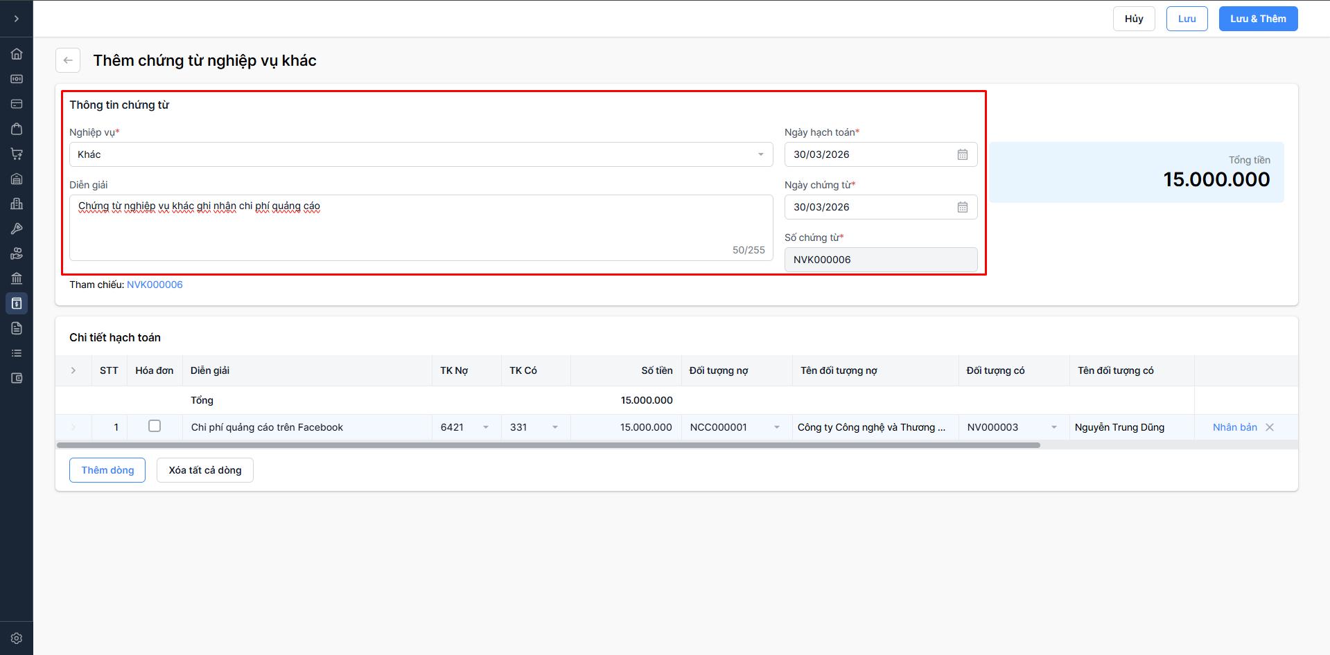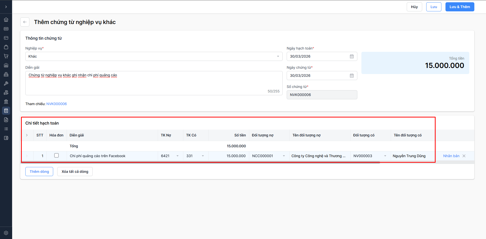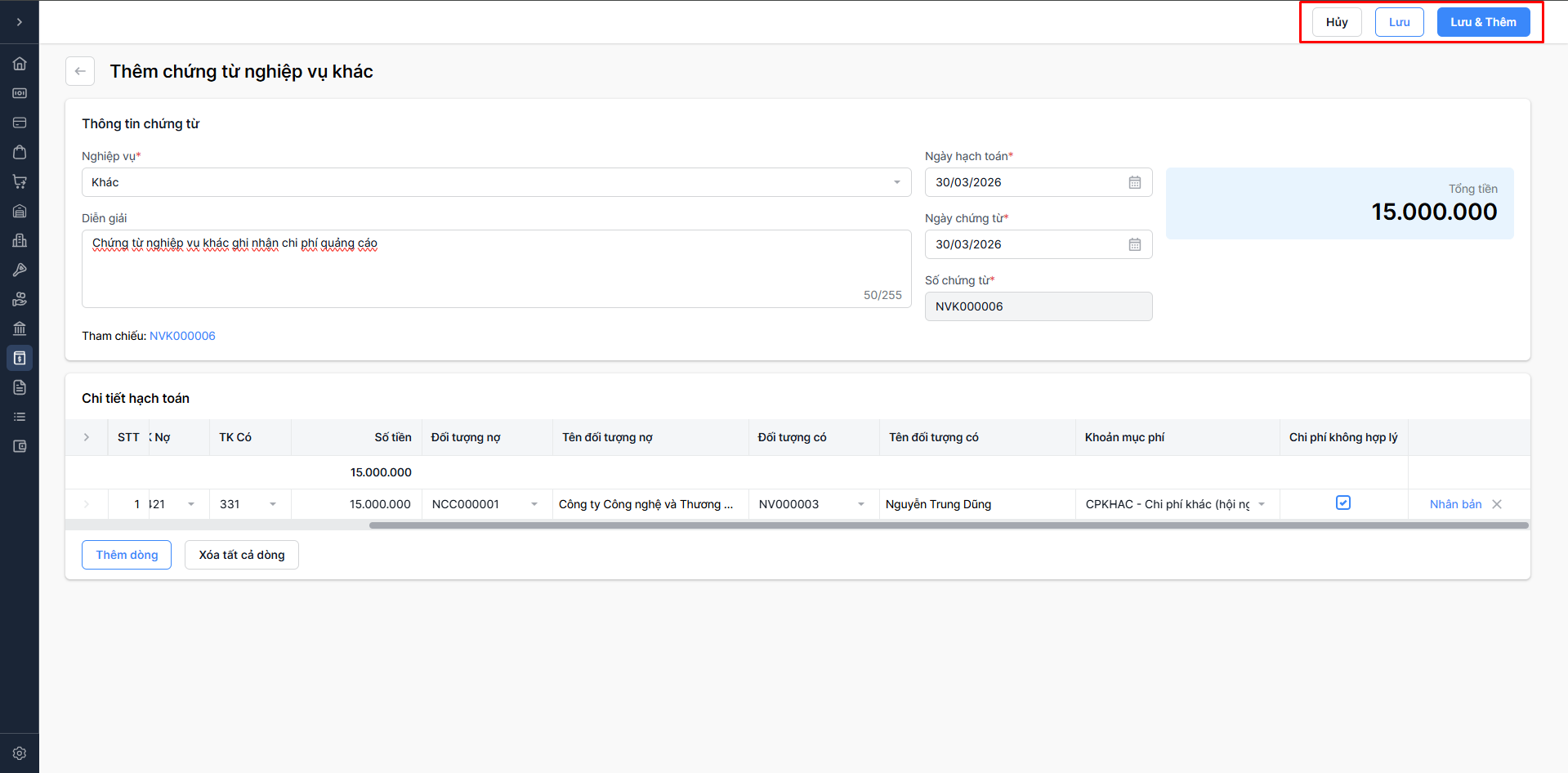 Chọn Lưu & thêm: Lưu thông tin chứng từ nghiệp vụ khác vừa nhập và tiếp tục thêm chứng từ nghiệp vụ khác mới.