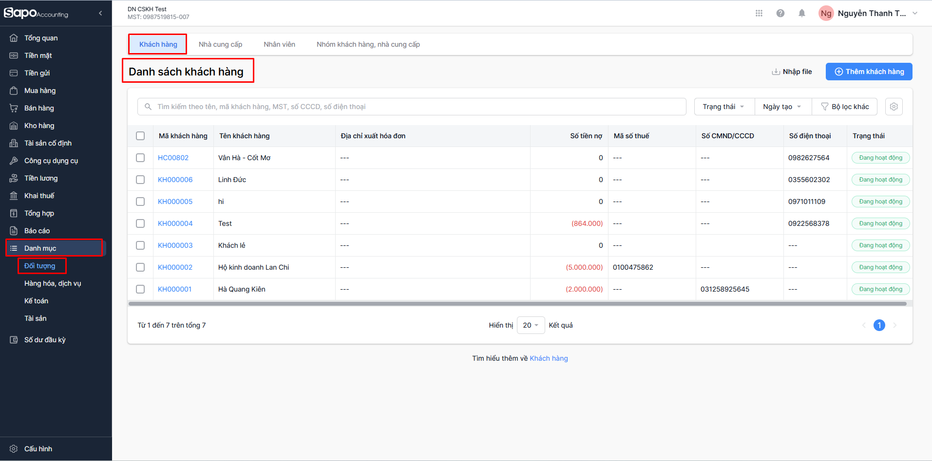 - Trên thanh menu bên trái trang quản trị, chọn Danh mục > Đối tượng, phần mềm sẽ điều hướng đến màn hình Danh sách khách hàng theo tab Khách hàng.