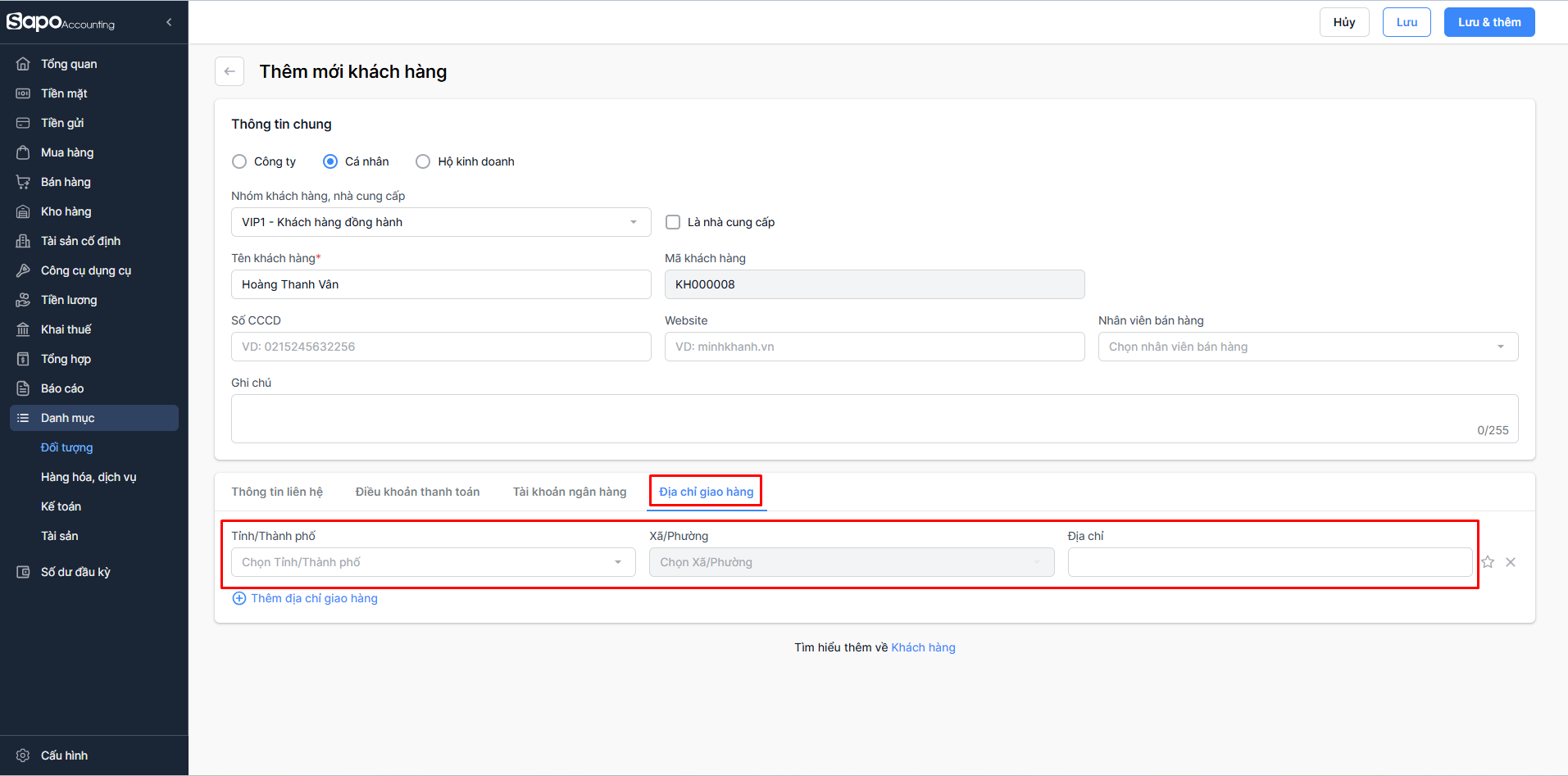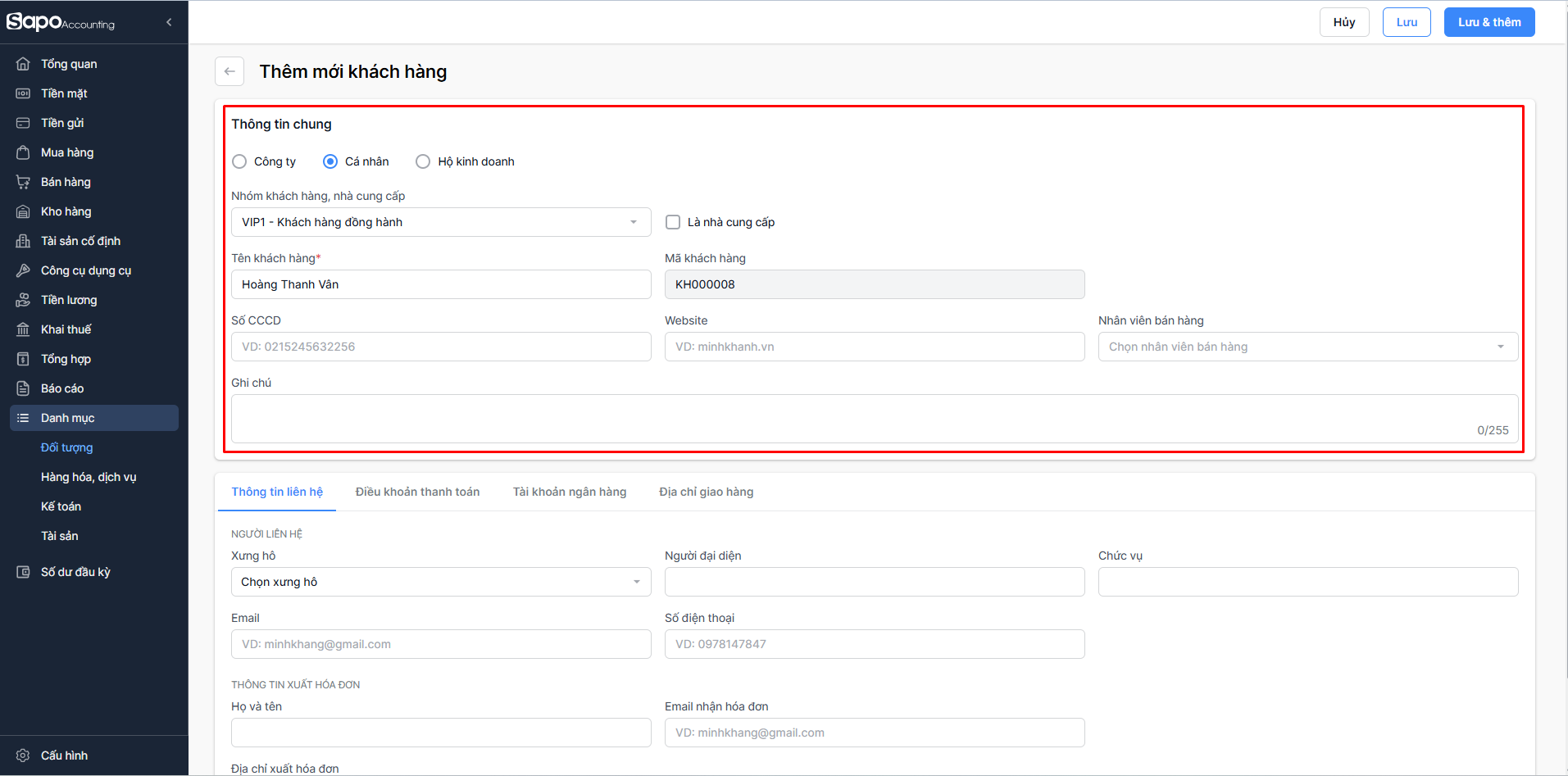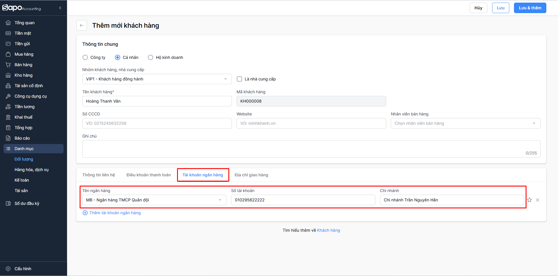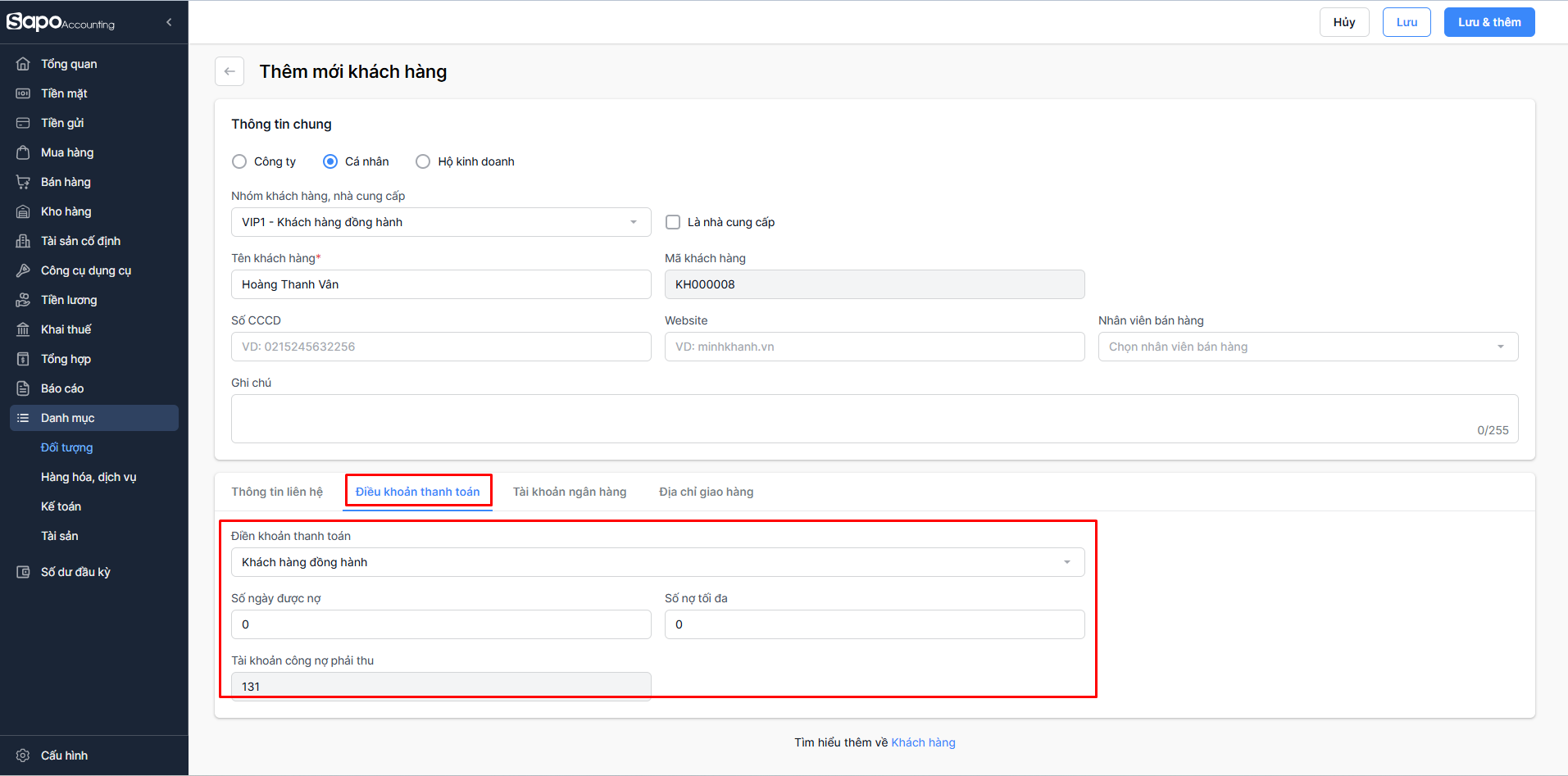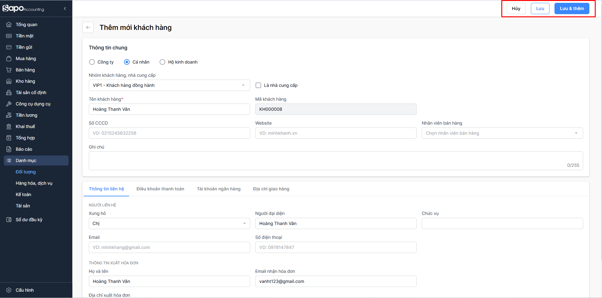 - Chọn Lưu & thêm nếu bạn muốn lưu khách hàng và tiếp tục thêm một khách hàng mới khác. Hệ thống sẽ tự động hiển thị màn hình Thêm mới khách hàng để bạn thao tác.