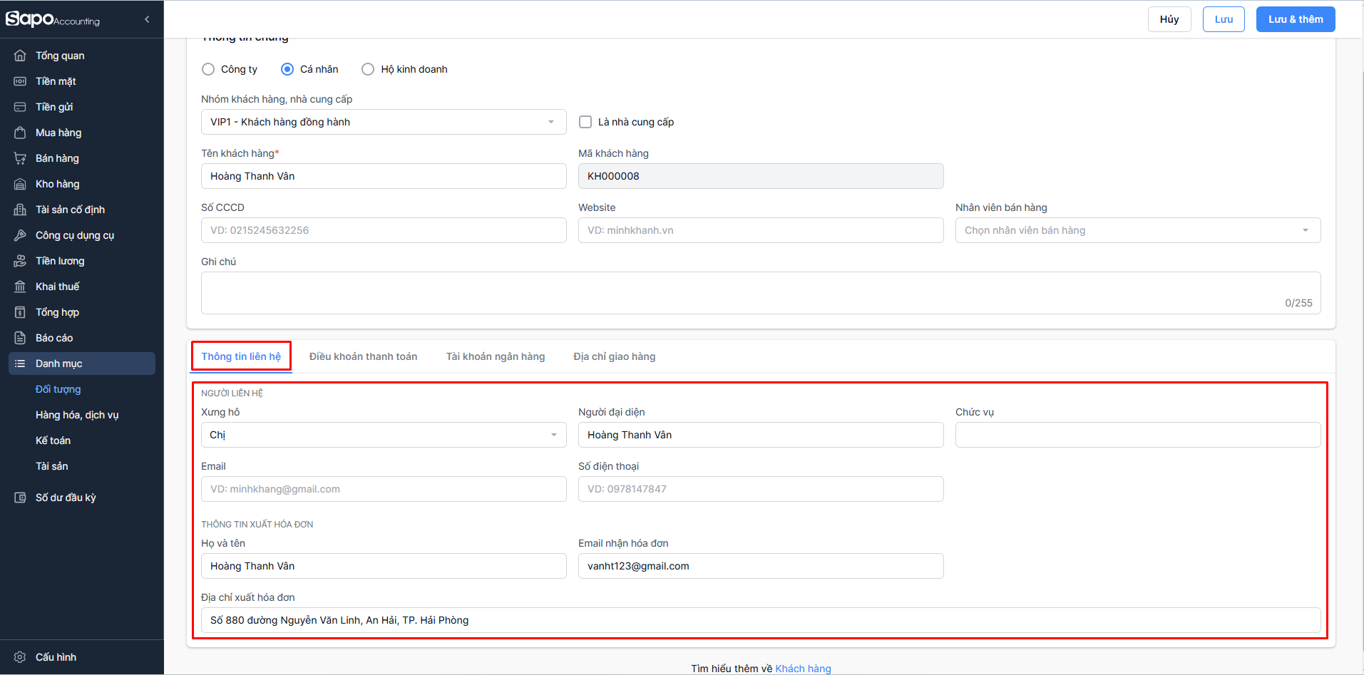 Bạn nhấp vào tab Thông tin liên hệ để thêm thông tin người liên hệ và thông tin xuất hóa đơn.