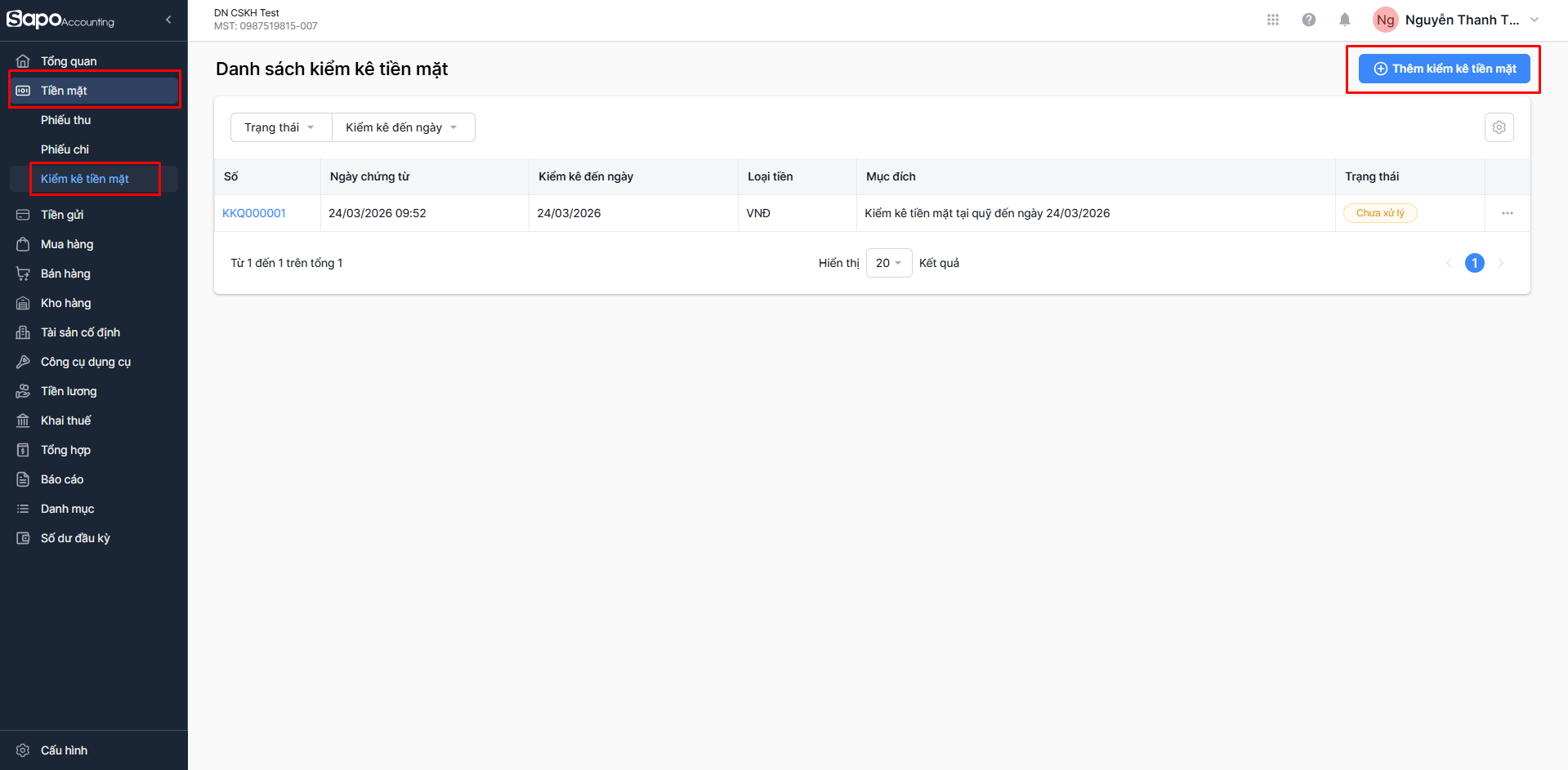 - Trên thanh menu bên trái trang quản trị, chọn Tiền mặt > Kiểm kê tiền mặt, phần mềm sẽ điều hướng đến màn hình Danh sách kiểm kê.