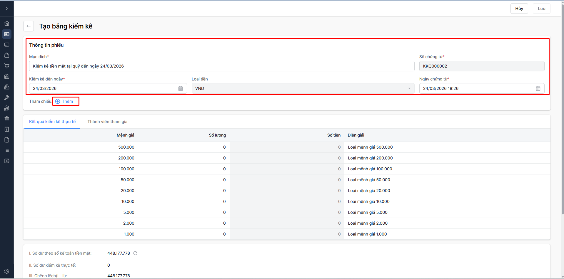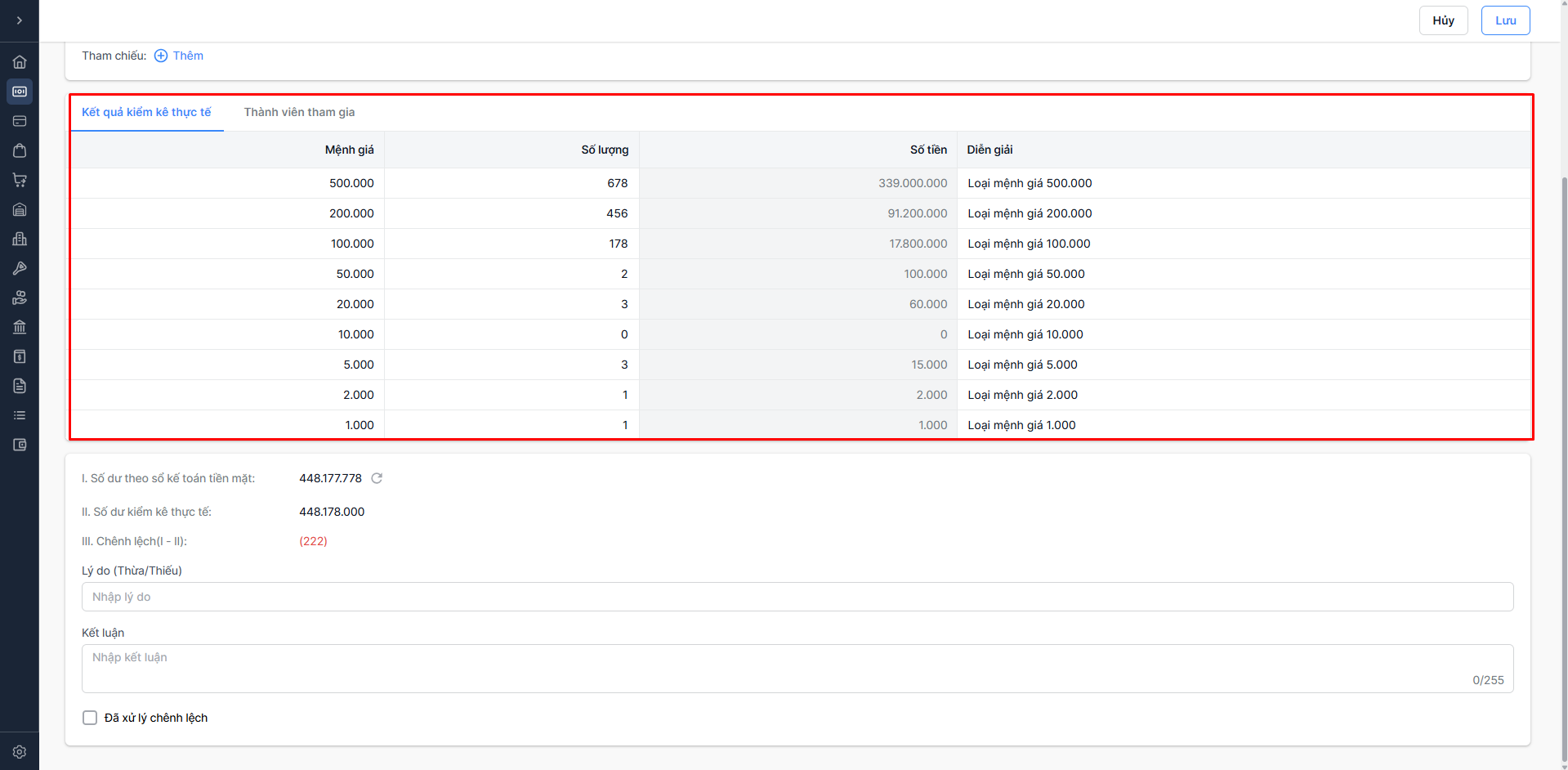- Chọn Hủy: Hủy biên bản kiểm kê tiền mặt và quay lại màn hình danh sách
