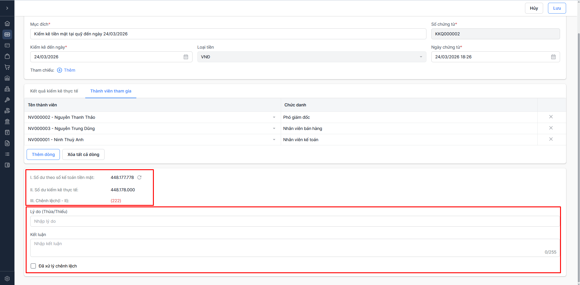 - Lý do (Thừa/Thiếu): Nhập mô tả nguyên nhân phát sinh chênh lệch (nếu có).