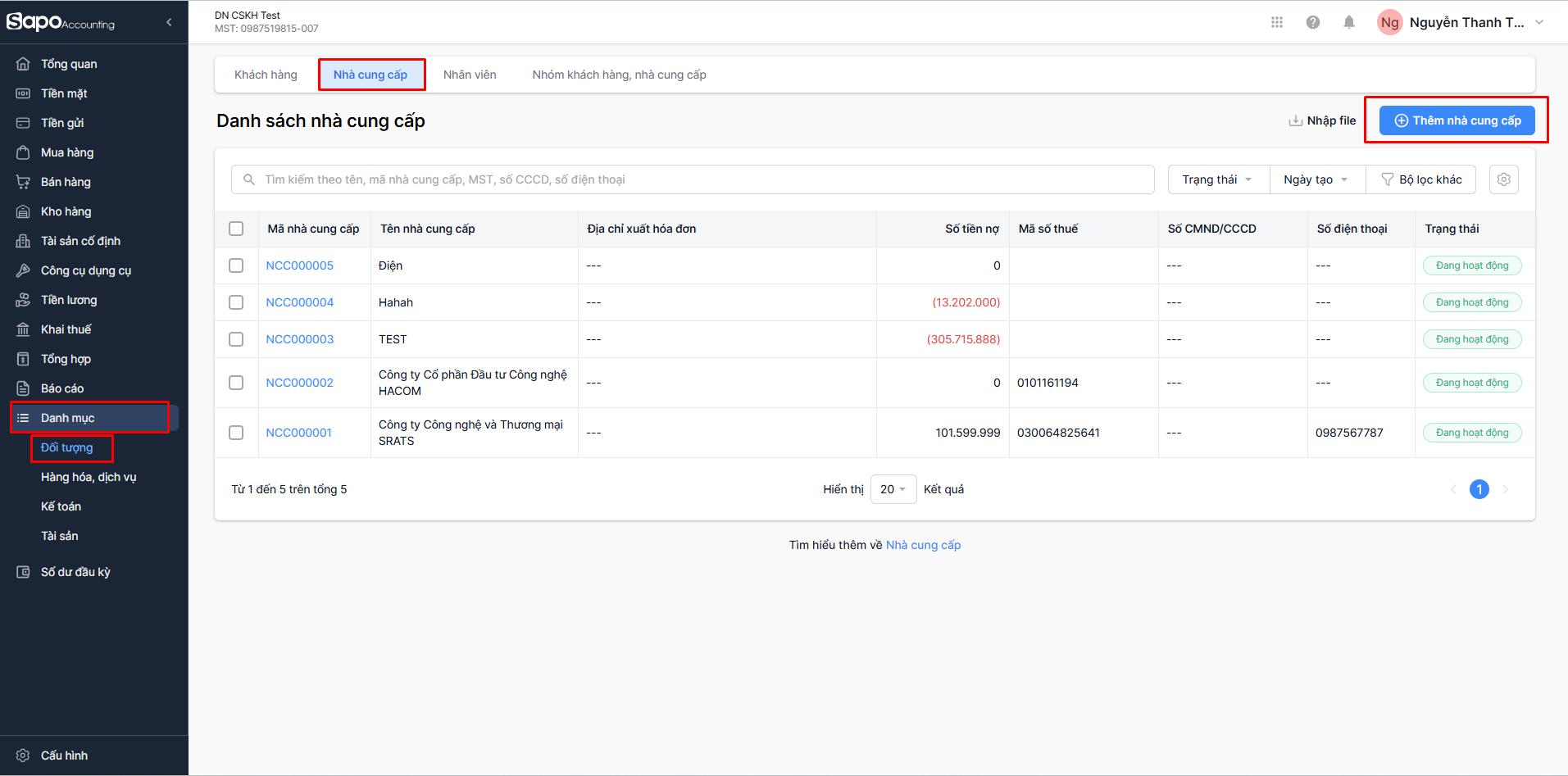 - Trên thanh menu bên trái trang quản trị, bạn chọn Danh mục. Tại màn hình Danh mục > Đối tượng vừa hiển thị, bạn nhấp chọn tab Nhà cung cấp trên thanh menu đầu trang. Hệ thống sẽ điều hướng bạn đến màn hình Danh sách nhà cung cấp.