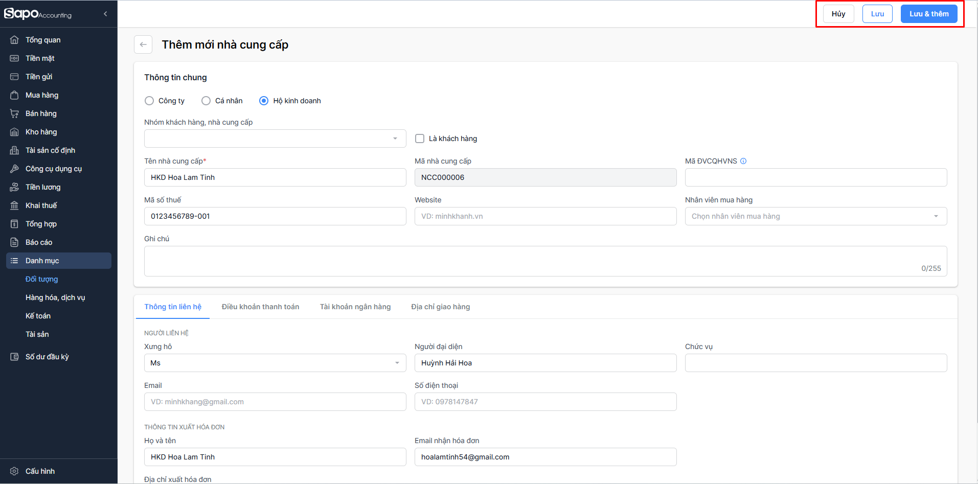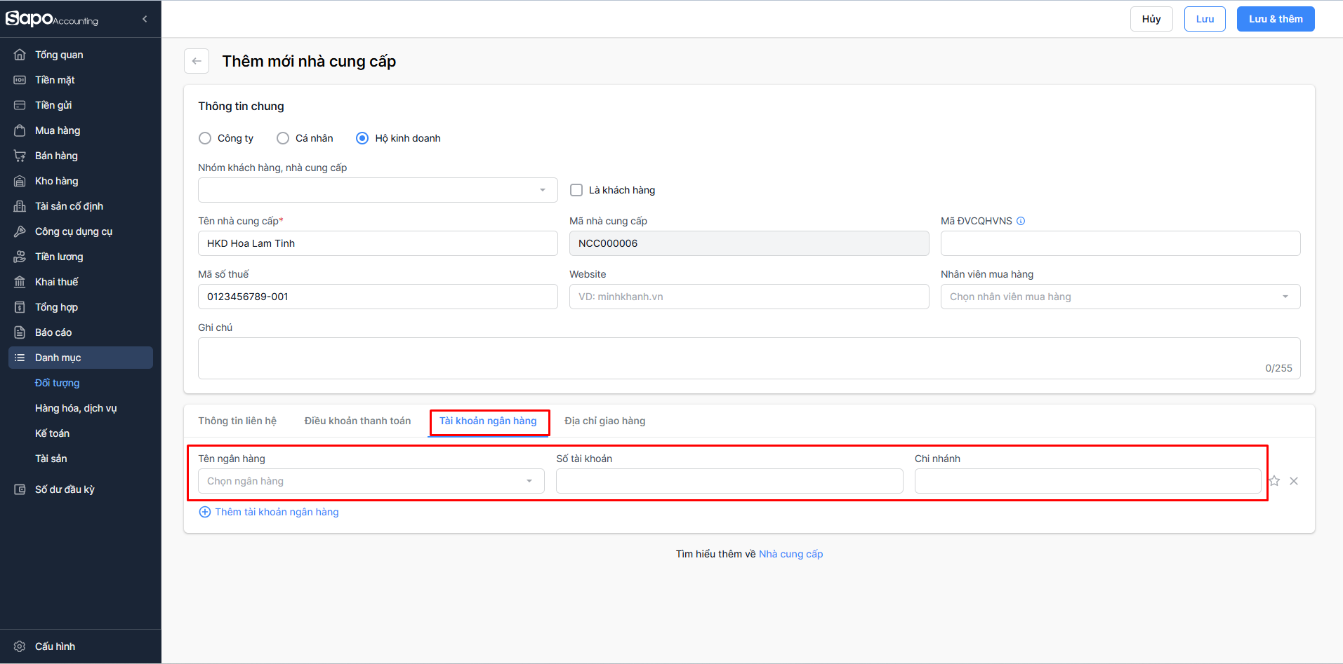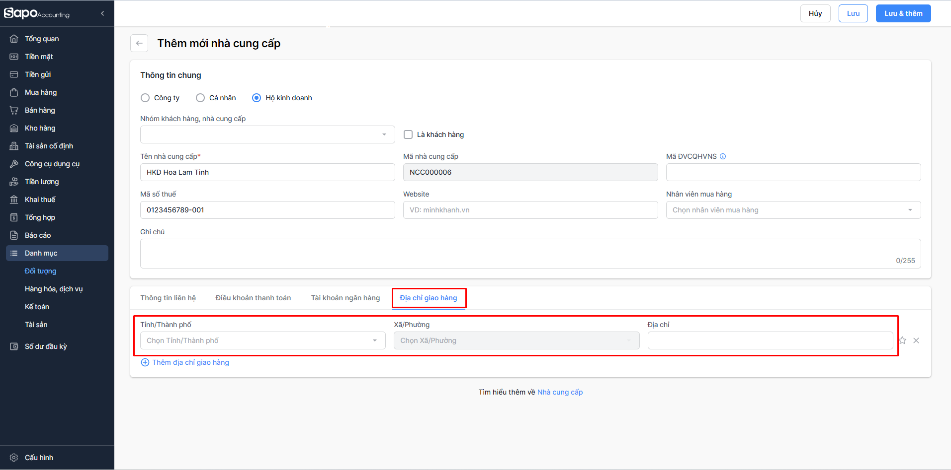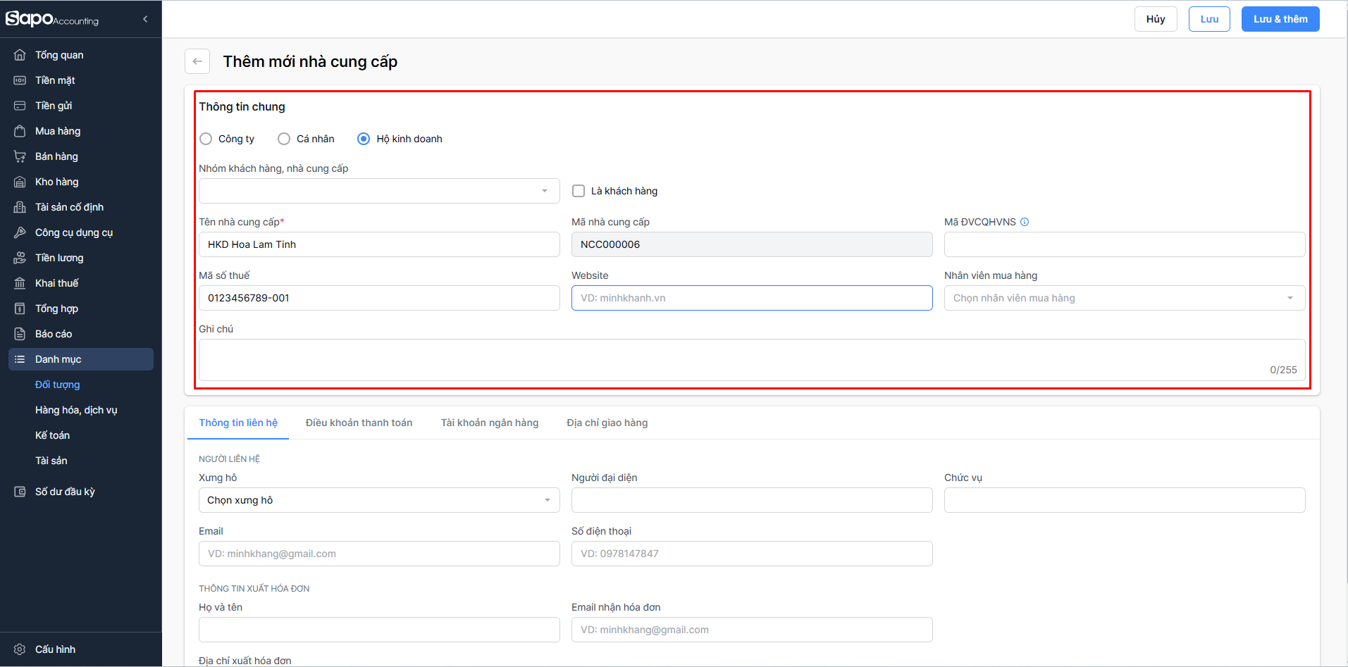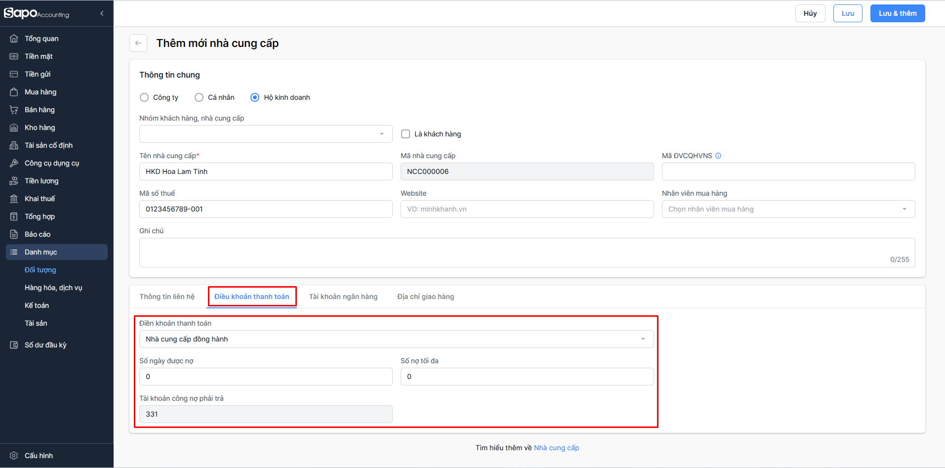 - Chọn Lưu & thêm nếu bạn muốn lưu nhà cung cấp và tiếp tục thêm một nhà cung cấp mới khác. Hệ thống sẽ tự động hiển thị màn hình Thêm mới nhà cung cấp để bạn thao tác.