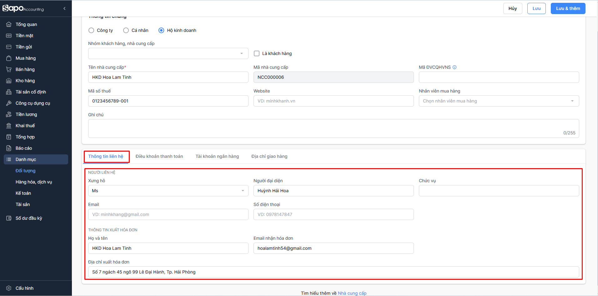 Bạn nhấp vào tab Thông tin liên hệ để thêm thông tin người liên hệ và thông tin xuất hóa đơn.