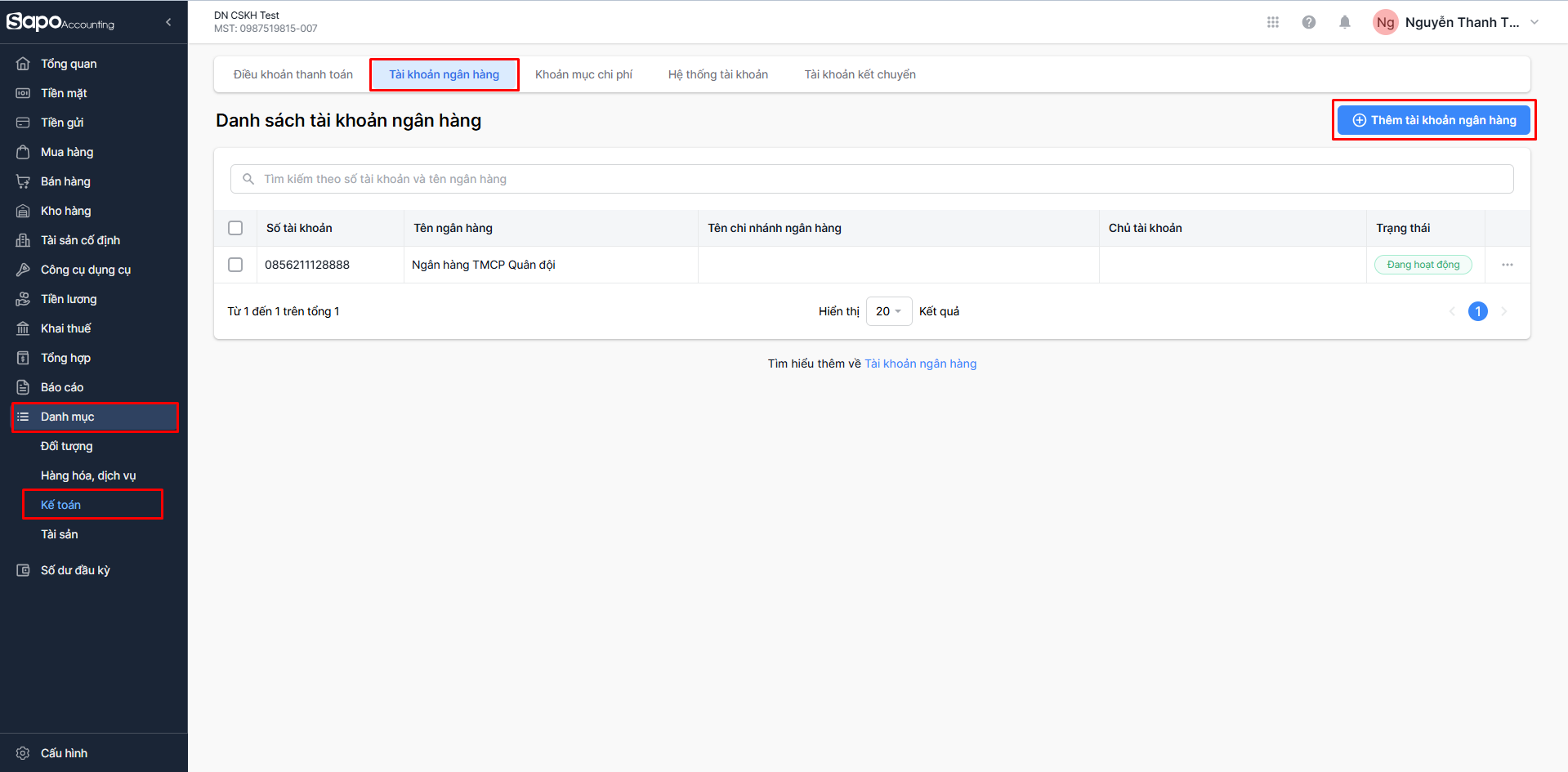 - Trên thanh menu bên trái trang quản trị, bạn chọn Danh mục > Kế toán. Bạn nhấp chọn tab Tài khoản ngân hàng trên thanh menu đầu trang.