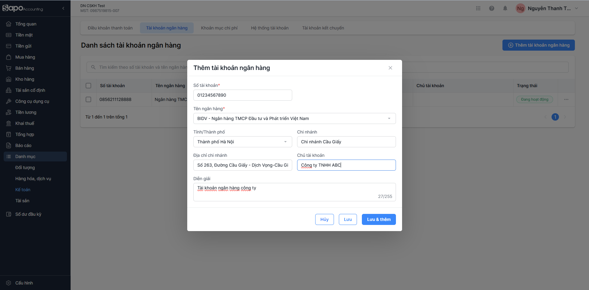 - Tại màn hình thêm mới, bạn khai báo các trường thông tin tài khoản ngân hàng như sau:
