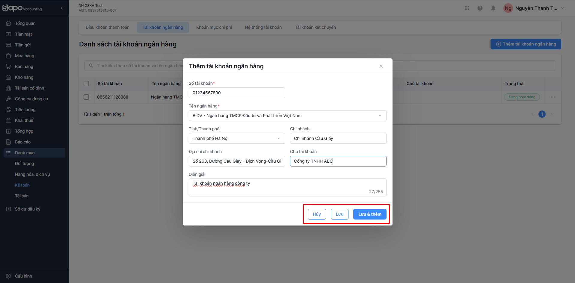 - Chọn Lưu & thêm nếu bạn muốn lưu tài khoản ngân hàng và tiếp tục thêm một tài khoản ngân hàng mới khác. Hệ thống sẽ tự động hiển thị màn hình Thêm tài khoản ngân hàng để bạn thao tác.